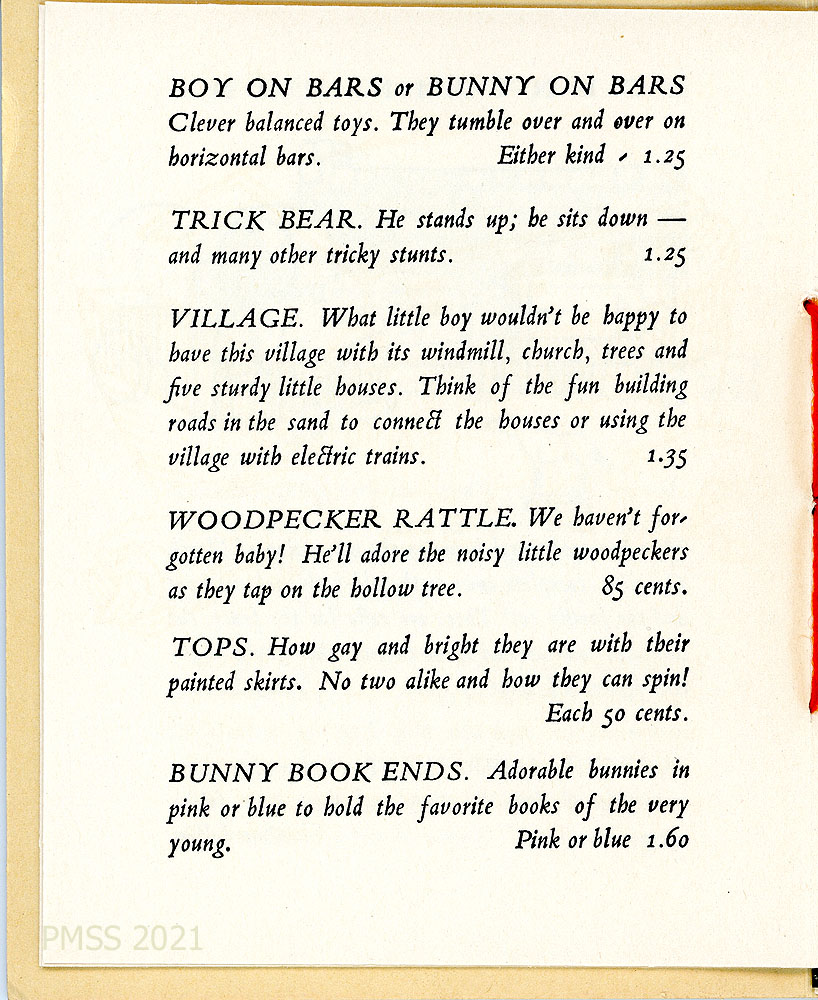 [toys_007] List with descriptions and prices: “BOY ON BARS” or “BUNNY ON BARS” balance toys, “TRICK BEAR, VILLAGE, WOODPECKER RATTLE, TOPS, BUNNY BOOKENDS”