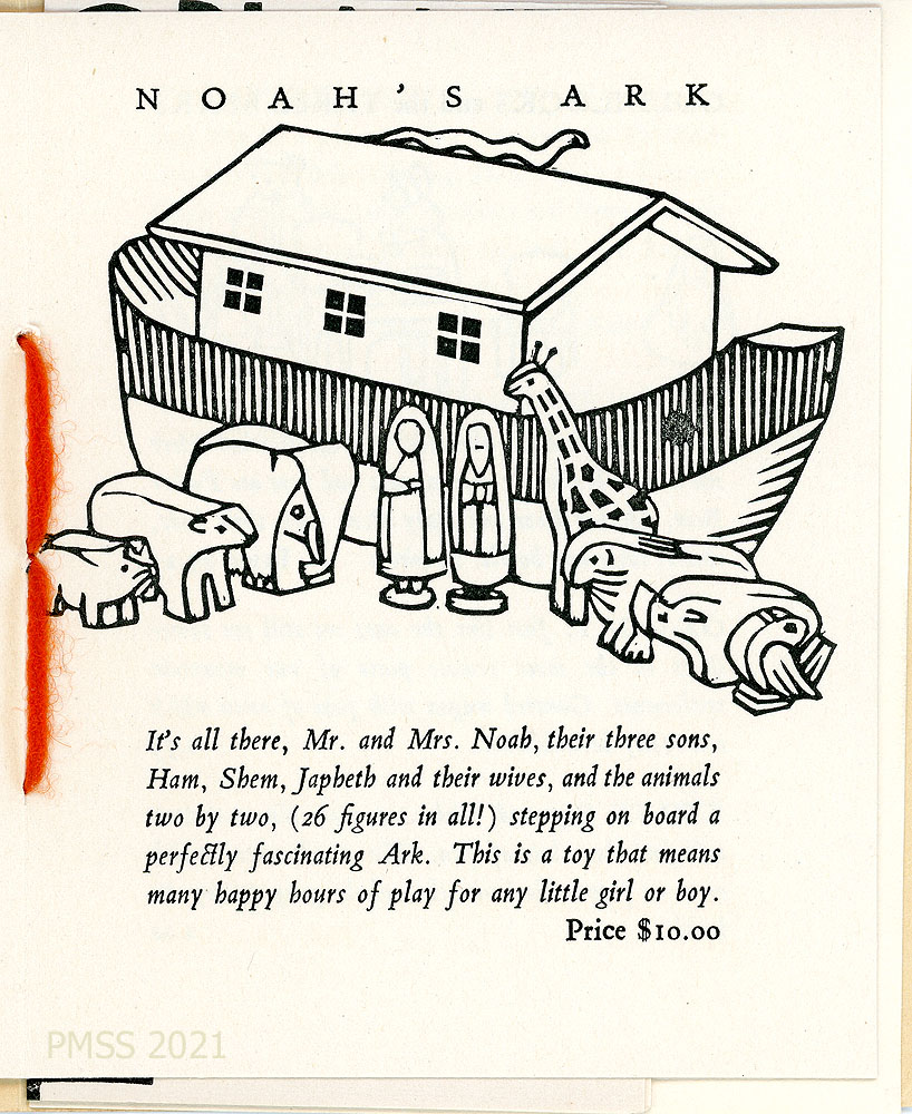 [toys_008] “NOAH’S ARK” – 26 figures, including Mr. and Mrs. Noah and their three sons, and the animals. Price $10. Image: Line drawing of ark and figures.
