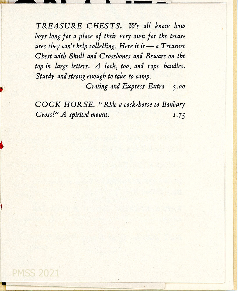 [toys_010] “TREASURE CHESTS” – With a skull and crossbone and “Beware” on the top, a lock, and rope handles. Price $5. “COCK HORSE” – Price $1.75.