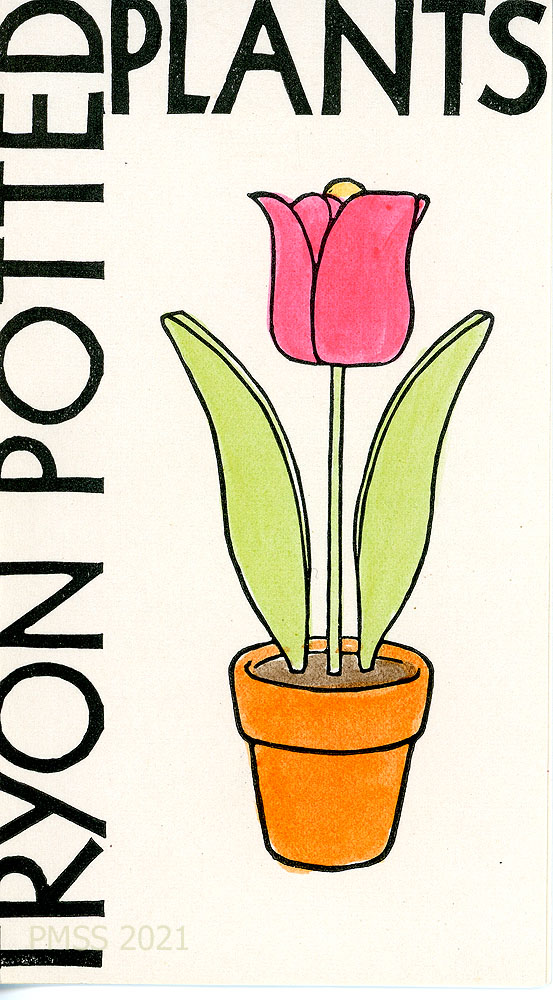 [plants_001] Brochure cover: “TRYON POTTED PLANTS.” Image: Line drawing of potted tulip in color.