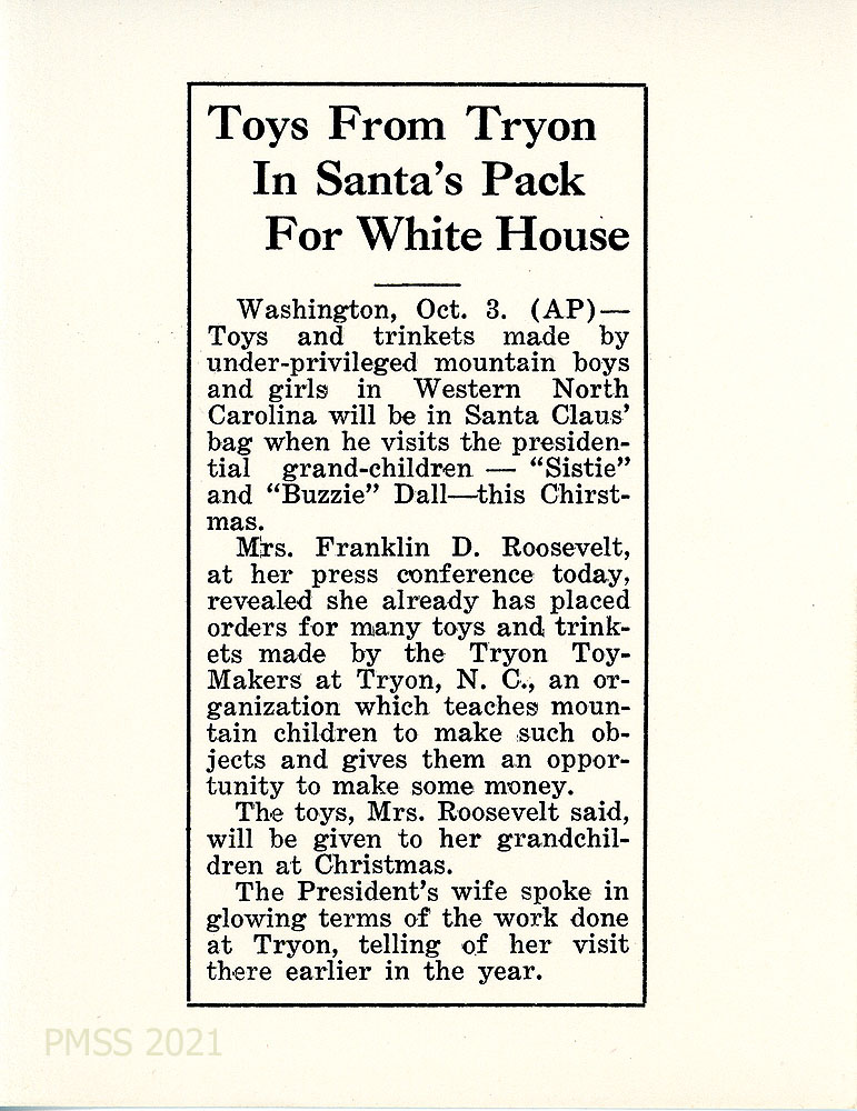 [white_hse_001] Newspaper clipping: “Toys From Tryon In Santa’s Pack For White House, … made by under-privileged mountain boys and girls in western North Carolina…” Mrs. Franklin D. Roosevelt revealed that she had placed Christmas orders for Tyron Toy-Makers toys and trinkets for her grandchildren, “Sistie” and “Buzzie” Dall. “The President’s wife spoke in glowing terms of the work done at Tryon, telling of her visit there earlier in the year.”