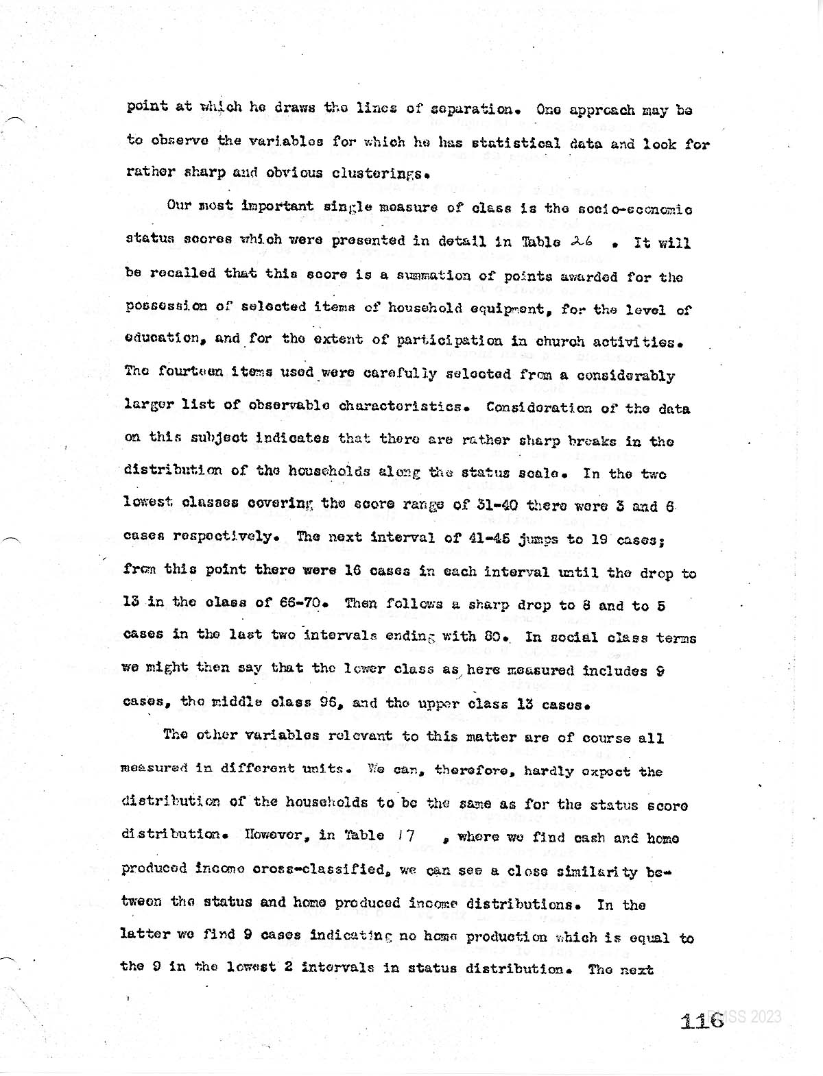 The real ” acid test” of notion They had three classes composed of relatively homogeneous households. Are actually present. Would require considerable amount of detailed treatment of our data. It would be necessary to bring the relevant data for each household together. And to Turman, whether or not certain households tended to monopolize the low scores on each scale, Others to dominate the middle ranges and a few. others to be characterized by the higher scores, however. We believe that the distribution of households on the socio – economic status score scale supports the foregoing hypothesis sufficiently for. Us not to feel ” conscience- stricken” for the avoidance of this extra labor. as a status score, is it combined score of 14 variables? We believe the results would be closely correlated with those of the above suggested detailed treatment.