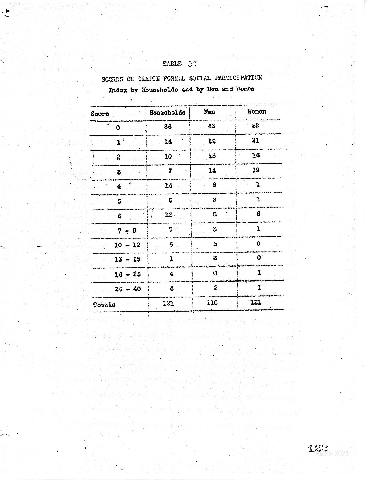 The lack of both formal organizations and participation in those existing. Is amply illustrated by the fact that, as shown in TABLE 39 the most common score was zero. Scores for the entire household were based on the combined scores of the husband and wife, or either alone. One further factor of note is the higher rate of participation among men than among women: more women than men had a zero score, and only three women had scores in excess of 6 as compared to 13 men. What we see betrayed here, but ………