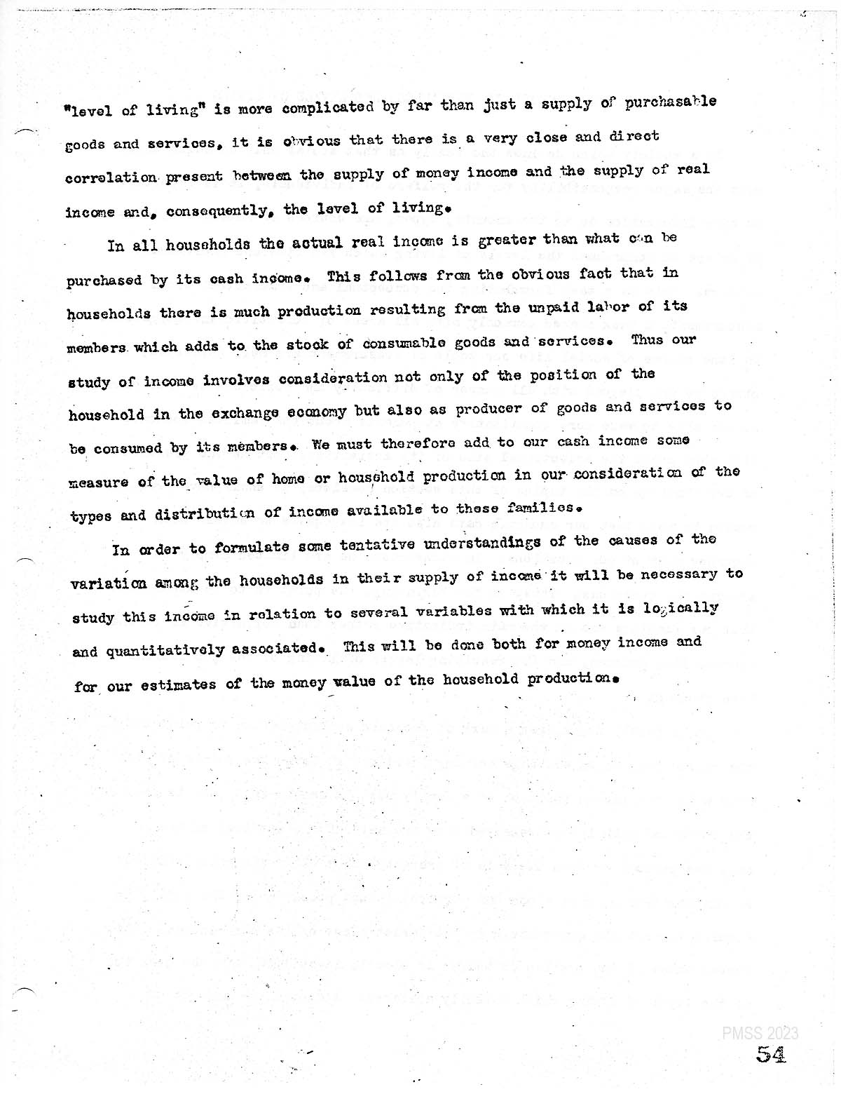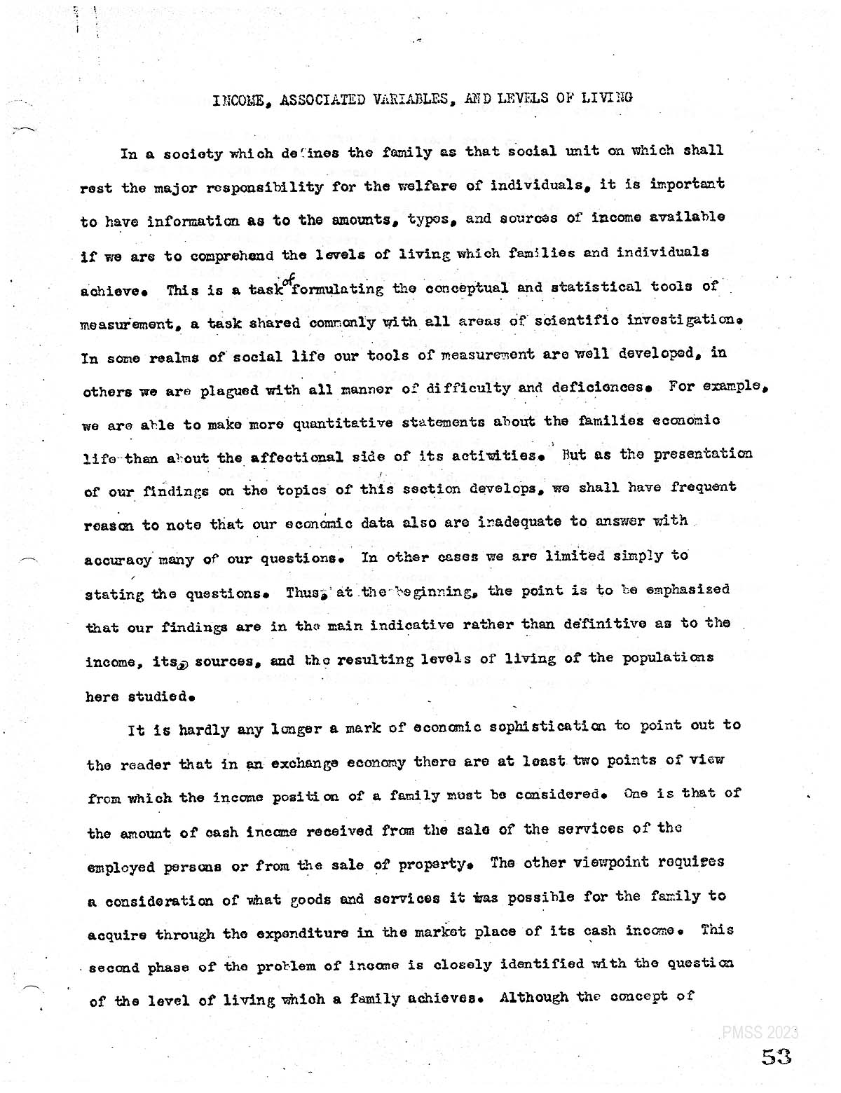 In a society which defines the family as that social unit in which shall rest the major responsibility for the welfare of individuals. It is important to have information as to the amounts. and sources of income available if we are to comprehend the levels of living which families and individuals achieve. This is a task of formulating the conceptual and statistical tools. Of measurement, a task shared commonly with all areas of scientific investigation. In. some realms of social life are tools of measurement are well developed in others we are plagued with all manner of difficulty and deficiencies. For example, we are able to make more quantitative statements about the families economic life than about the affectional. side of its activities. but as the. Presentation of our findings on the topics of this section developed. We shall have frequent reason to note that our economic data also are inadequate to answer with accuracy. Many of our questions in other. cases, we are limited simply to stating the questions thus. at the beginning the point is to be emphasized that our findings are in the Main Indicative rather than definitive as to the income, its sources and the resulting levels of living of the populations here studied.