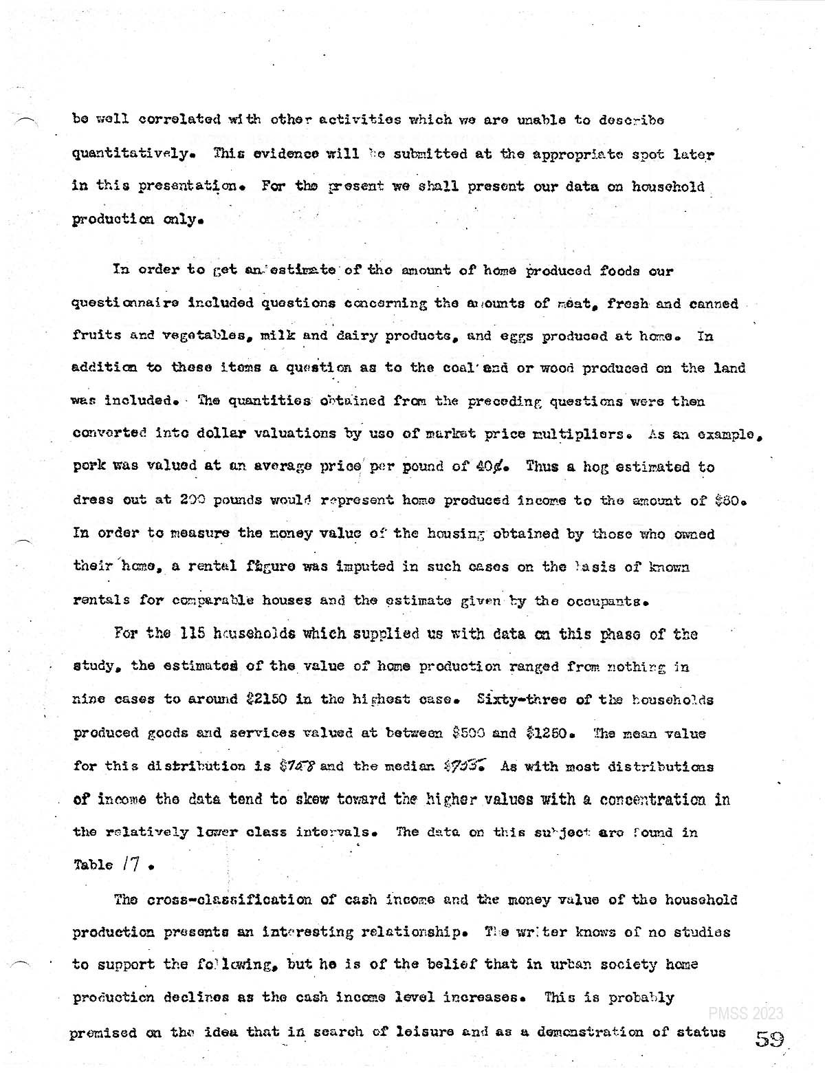 In order to get an estimate of the amount of home produced foods are questionnaire included questions concerning the amounts of meat, fresh and canned fruits and vegetables, milk and dairy products. And eggs produced at home. In addition to these items, a question as to the coal and or wood produced on the land was included The quantities obtained from the preceding questions. Were then converted into dollar valuations by use of market price multipliers. As an example, pork was valued at an average price per pound of 40 cents. But a hog estimated to dress out at 200 pounds would represent home produced income. To the amount of $80? in order to measure the money value of the housing obtained by those who owned their home, a rental figure was imputed and Such cases. on the basis of known rentals for comparable houses and the estimates given by the occupants