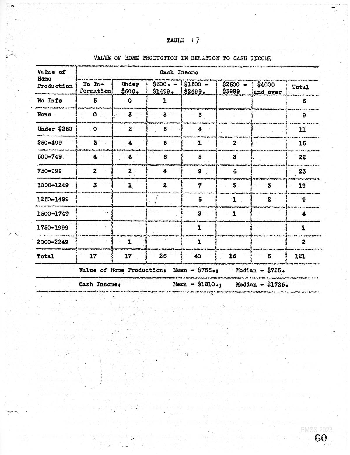 for the 115 households which supplied us with data on this phase of the study, the estimates of the value of home production ranged from nothing in nine cases to around $2150 in the highest case. Sixty three of the households produced goods and services valued at between $500 and $1250 The mean value for this distribution is $758 and the median $755 As with most distributions of income, the data tend to skew. Toward the higher values with a concentration in the relatively lower class intervals. The data on this subject are found in table 17.