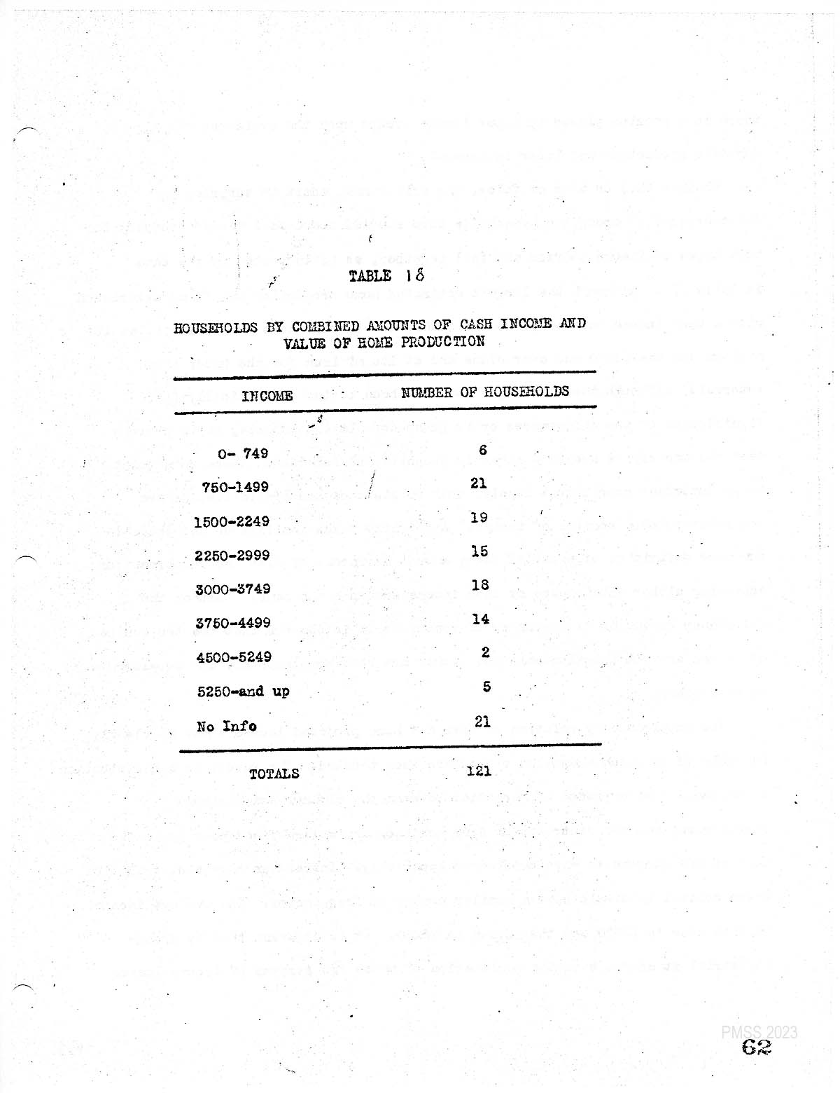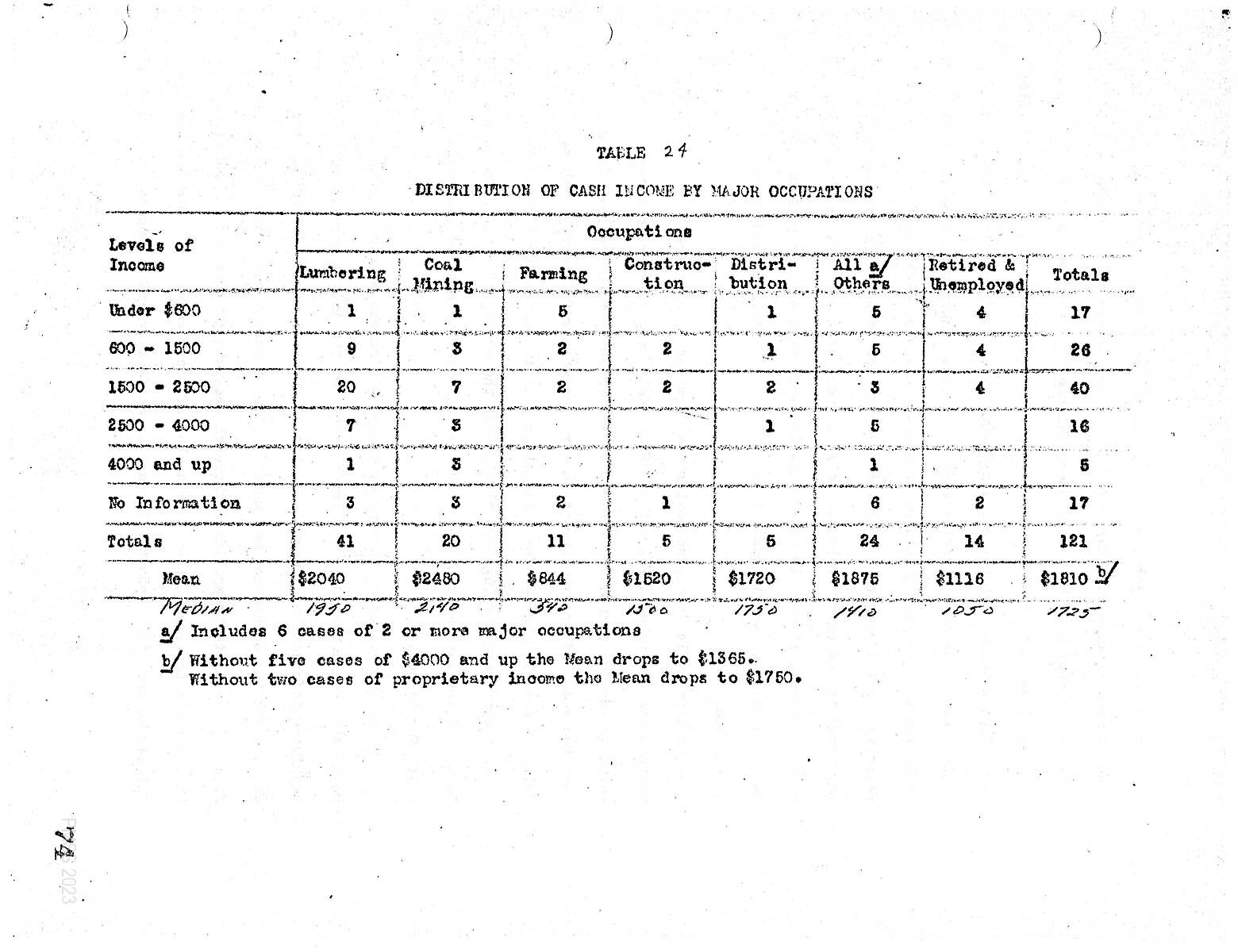 The mean or average cash income was $1810 for the 104 cases and a median estimate at $1725. The. generally low level of cash income can be brought out more forcefully if we compute the average for all cases providing information except those in excess of $4000. The average. then falls to three$1300. [1]