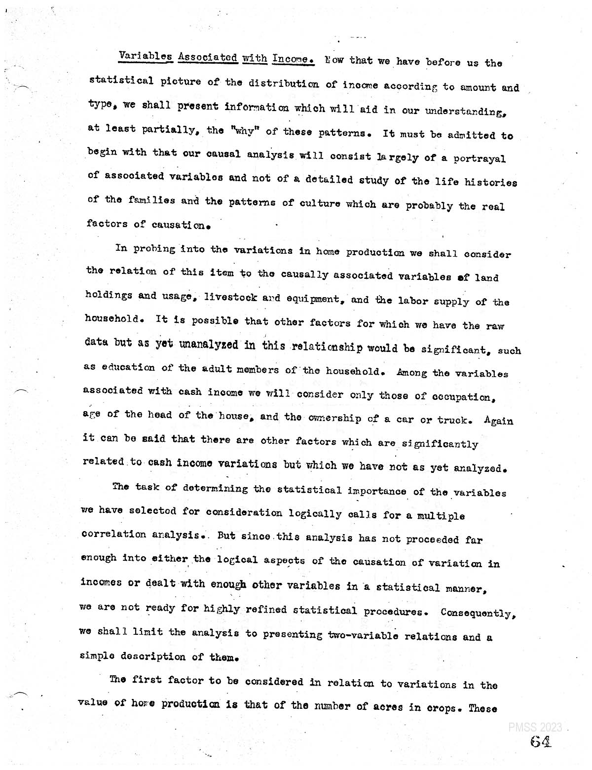 in probing into the variations in home production, we shall consider the relation of this item to the casually associated variables of land holding and usage, livestock and equipment, and the labor supply of the household. It is possible that other factors for which we have the raw data, but as yet unanalyzed in this relationship, would be significant, such as. education of the adult members of the household. Among the variables associated with cash income, we will consider only those of occupation, age of the head of the house and the ownership of a car or truck. Again, it can be said that there are other factors which are significantly related to cash income variations, but which we have not as yet analyzed.