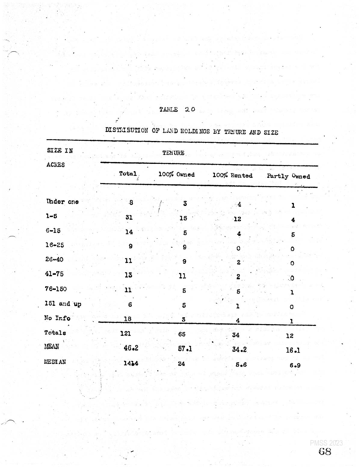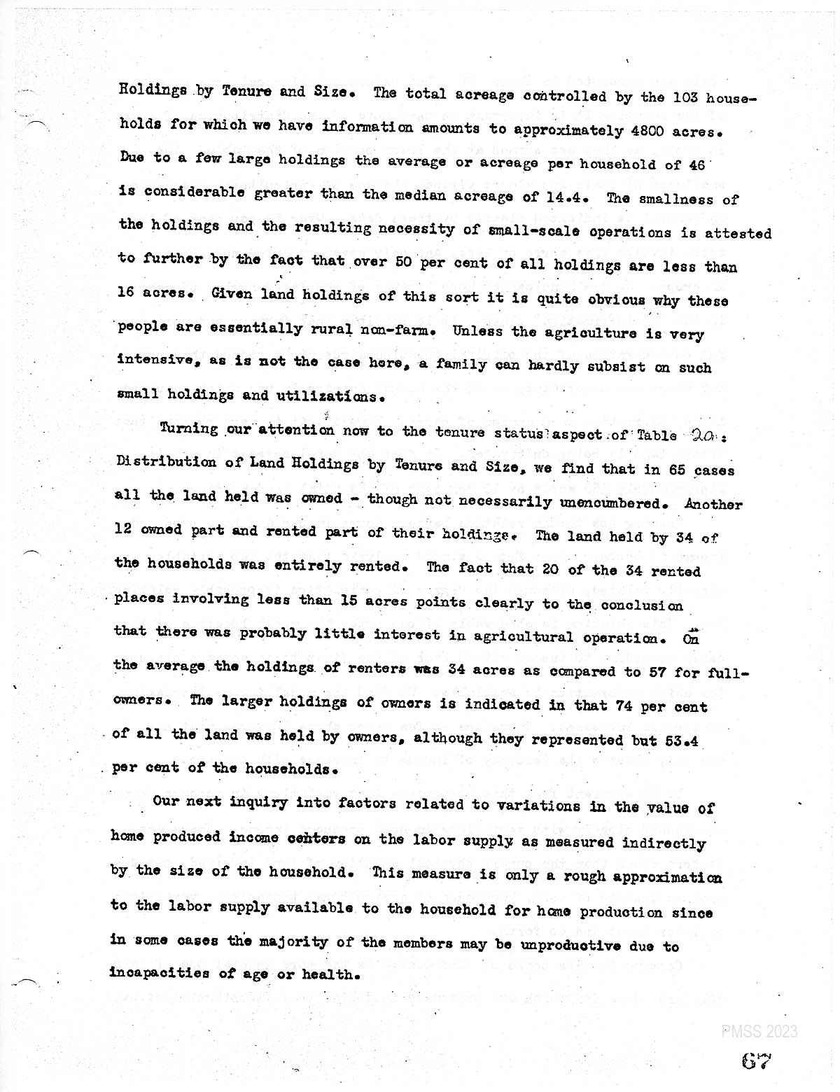 [Ref. to : Table 20: Distribution of Land Holdings by Tenure and Size.]  Acreage controlled by the 103 households for which we have information amounts to approximately 4800 acres. Due to a few large holdings of the average or acreage, perhaps. great considerably greater than the median acreage of 14.4. The small. of the holdings and the resulting necessity of small scale operations. Is attested to further by the fact that over 50% of all holdings are less than 16 acres. Given land holdings of this sort, it is quite obvious why these people are essentially rural non farm. Unless the agriculture is very intensive, as is not the case here, a family can hardly subsist on such small holdings and utilizations.