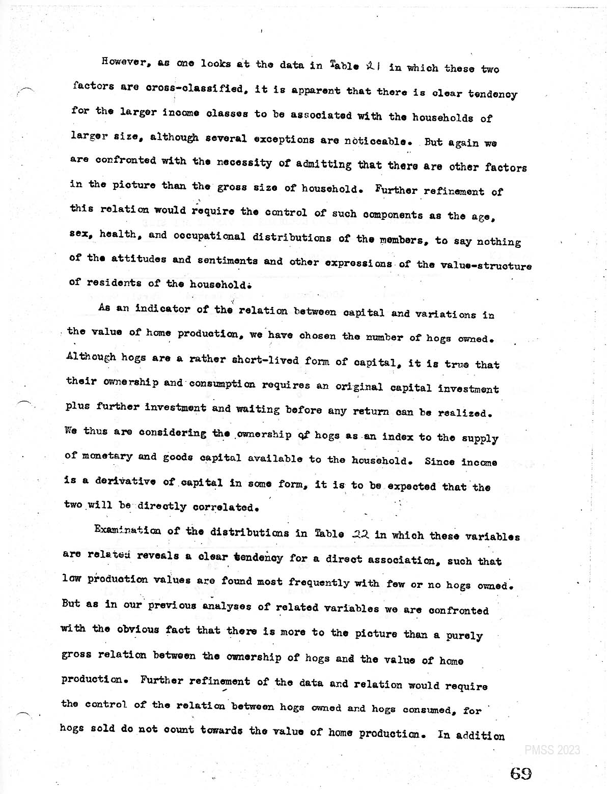 Examination of the distributions in Table 22 in which these variables are related, reveals a clear tendency for a direct association, such that low production values are found most frequently with few or no hogs owned. But as in our previous analysis of. related variables, we are confronted with the obvious fact that there is more to the picture than a purely gross relation between the ownership of hogs. And the value of home production. Further refinement of the data and relation Would require the control of the relation between hogs owned in hogs consumed hogs. for hogs. sold do not count toward the value of home production. In addition, in addition….