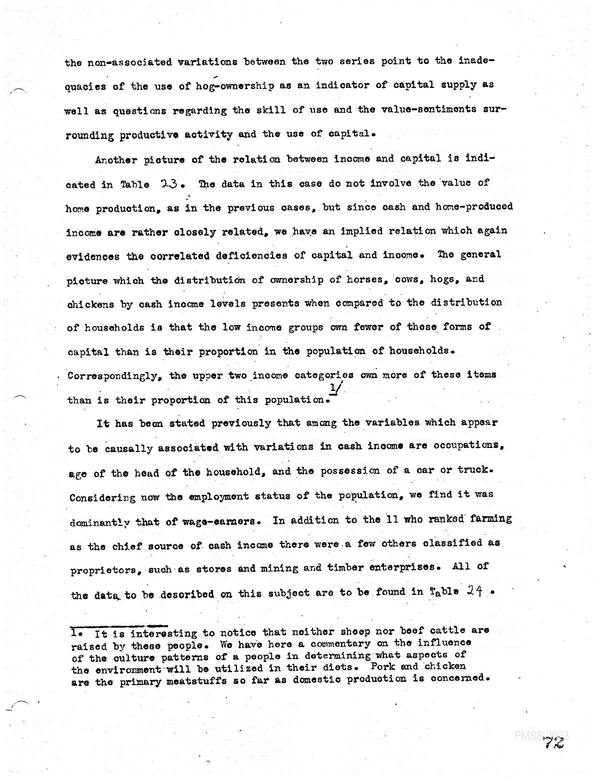 Another picture of the relation between income and capital is indicated in TABLE 23. – The data in this case do not involve the value of home production, as in the previous cases. But since cash in home, produced. Income are rather closely related. We have an implied relation which, again, evidences the correlated deficiency of capital. and income. The general picture which the distribution of ownership of horses. Cows, hogs and chickens by cash income levels presents when compared to the distribution of households, is that the low income groups own fewer of these forms of capital. Then is there proportion in the population of households. Correspondingly, the upper two income categories own more of these items than is their proportion of this population. (1)