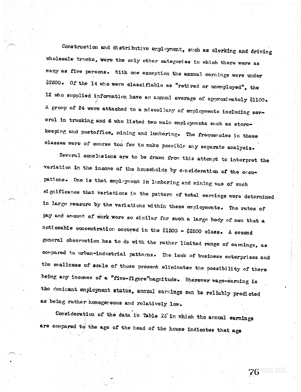 Several conclusions are to be drawn from this attempt to interpret the variation and the income of the households by consideration of the occupations. One is that employment in lumbering and mining was of such significance that variations in the pattern of total earnings was determined in large measure by the variations within these employments. The rates of pay and amount of work were so similar for such a large body of men that a noticeable concentration occurred in the $1502 – $2500 class. A second general observation has to do with the rather limited range of earnings, as compared to urban-industrial patterns. The lack of business enterprises and the smallness of scale of those present eliminates the possibility of their being any income of a ” 5 figure” magnitude. Wherever wage earning is the dominant employment status, annual earnings can be reliably predicted as being rather homogeneous and relatively low.