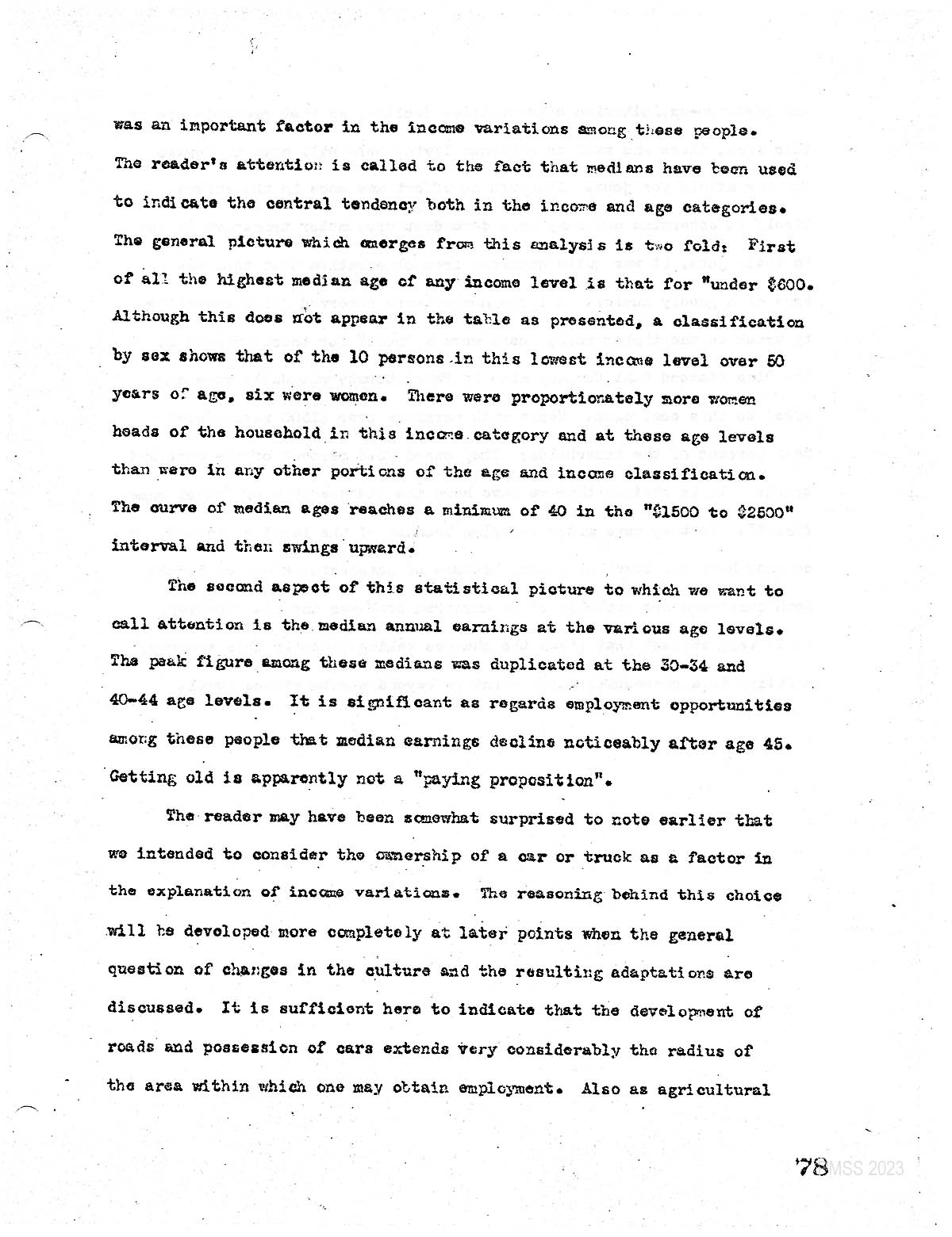 … Was an important factor in the income variations among these people. The reader’s attention is called to the fact that medians have been used to indicate the central tendency, both in the income and age categories. The general picture which emerges from this analysis is twofold: First of all, the highest median age of any income level is that for “…$600. Although this does not appear in the table as presented, a classification by sex shows that of the 10 persons in this lowest income level over 50 years of age. Six were women. There were proportionately more women heads of the household in this income category. And at these age levels, then were in any other portions of the age and income classification. The curve of median ages reached a minimum of forty in the “$1500 to $2500″ Interval and then swings upward.