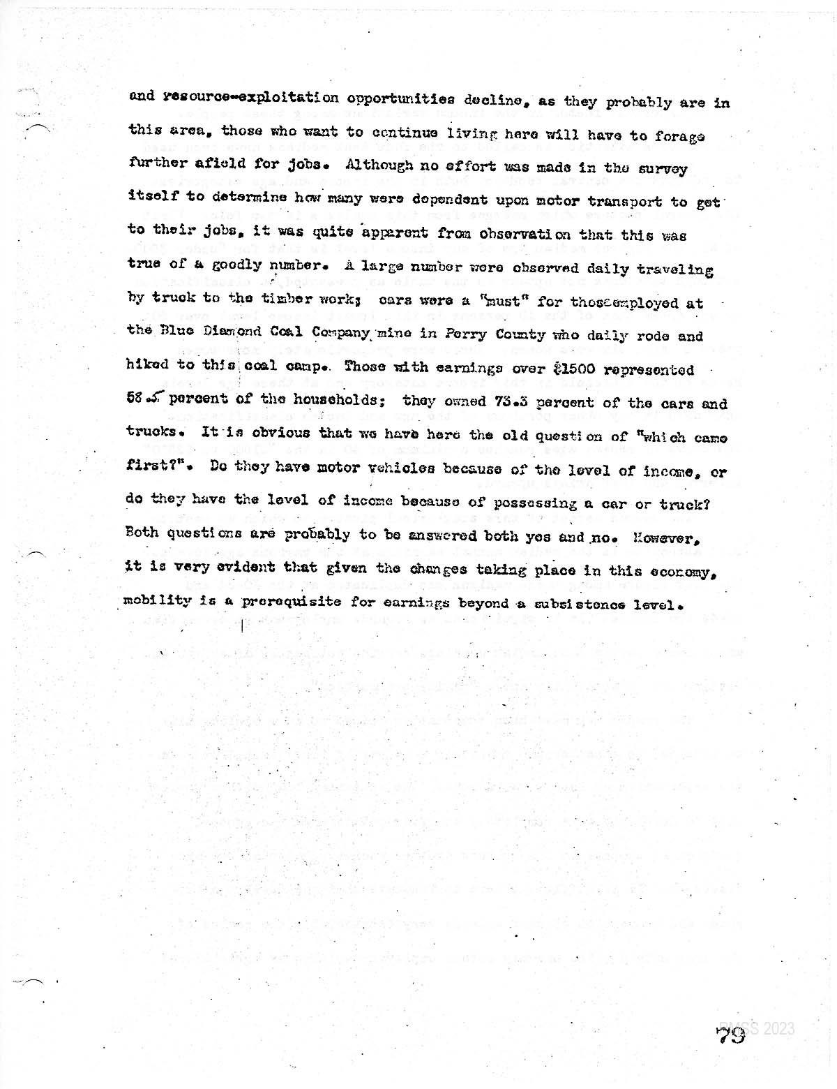 … and resource- Exploitation opportunities decline, as they probably are in this area, those who want to continue living here will have to forage further afield for jobs. Although no effort was made in the survey itself to determine how many were dependent upon motor transport to get to their jobs, it was quite apparent from observation that this was true of a goodly number. A large number were observed daily, traveling by truck to the timber work; cars were a “must” for those employed at the Blue Diamond Coal Company Mine in Perry County, who daily rode and hiked in to this coal camp. Those with earnings over $1500 represented. 68.5% [58.5% ?] of the households; they owned  73.3% of the cars and trucks. It is obvious that we have here the old question of ” which came first?” do they have motor vehicles because of the level of income or do they have the level of income because of possessing a car or truck? Both questions are probably to be answered both yes and no. Is very evident that, given the changes taking place in this economy, mobility is a prerequisite for earnings beyond a subsistence level.
