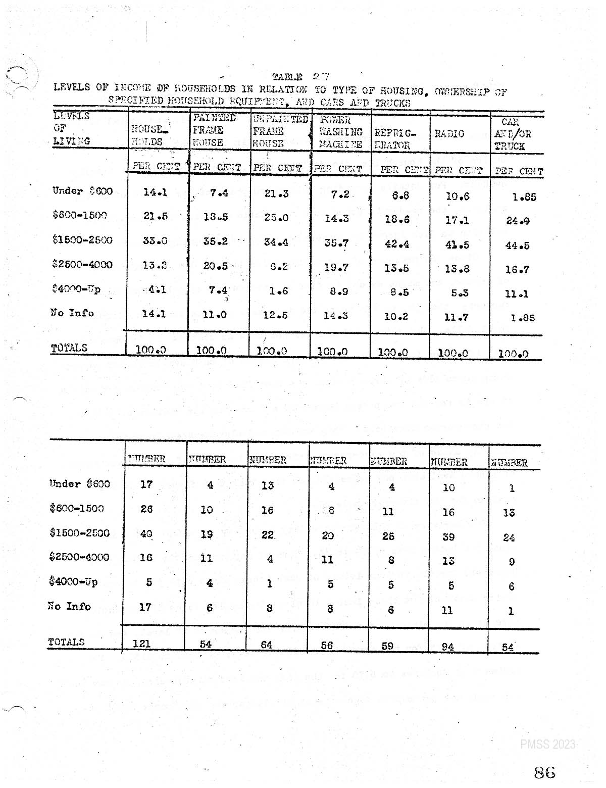 The second phase of this analysis of levels of living centers on the relation between the supply of consumers’ capital goods and cash income. In table 27 we have a clear indication of the importance of cash income as a determinant of the possession of certain types of consumers, capital goods. Here we compare the percentage of households. On each income level, with the percentage distribution of the various goods on the same income levels, the general picture which these comparisons present is that with the exception of the “unpainted frame house” category, the income levels less than $1500 possess a smaller percentage of the specific goods than their percentage in the population. And, with the same exception those households in the income levels more than.$1500 possess a greater percentage of these same goods than in is their percentage in the population. The discrepancies between the percentages tend to increase with the increase in the income level. With. the exception of radios. the low income categories, as might be expected, occupy more unpainted frame houses than their percentage in the population; the reverse is true of the upper income levels. [1.]