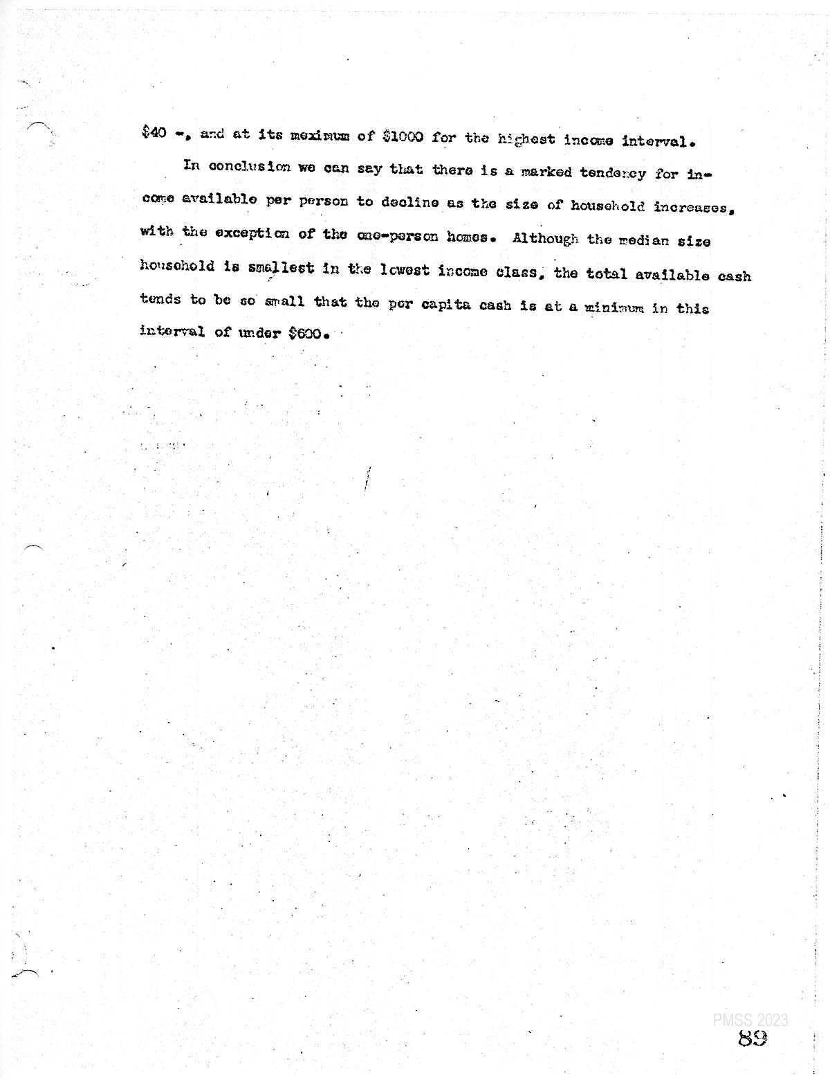 Given the presence of large households and the low general level of income, one might expect to find an inverse relation between these factors; that is. as the household increases in size, the cash income level falls. But this prediction is not true, as stated. It becomes true only if stated in terms of the average amount of cash available per person among households of various size. We then find that our highest per capita figure is for the two person household and reaches its minimum of $180 for the nine – person household. Both the. ten and eleven – person households were slightly ahead of the nine – person interval. In terms of the average amount of income available per household, we find that this figure is at its maximum for the five – person level.