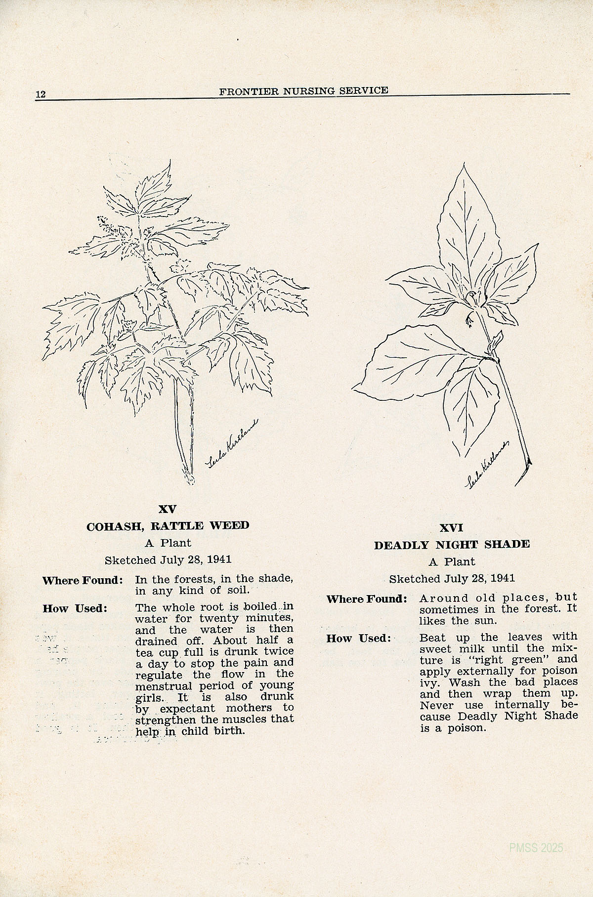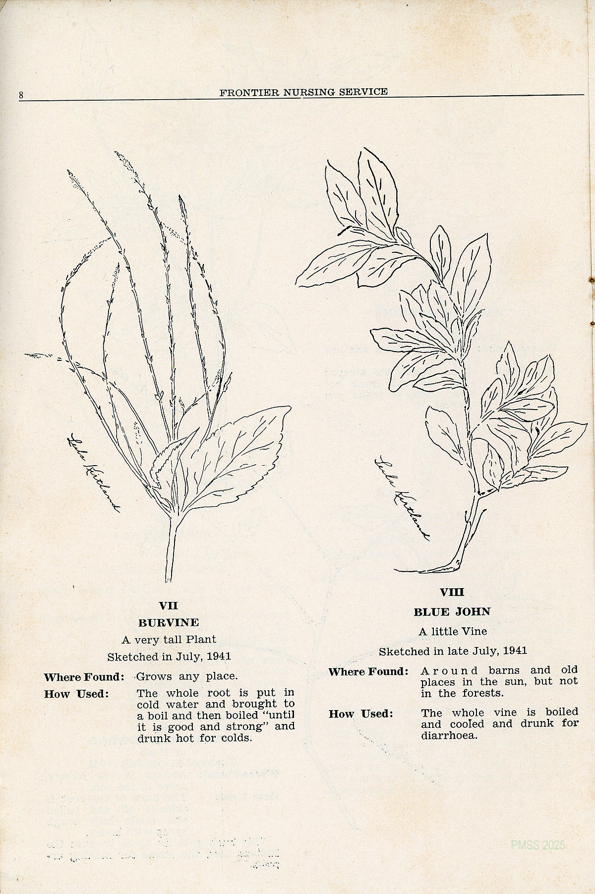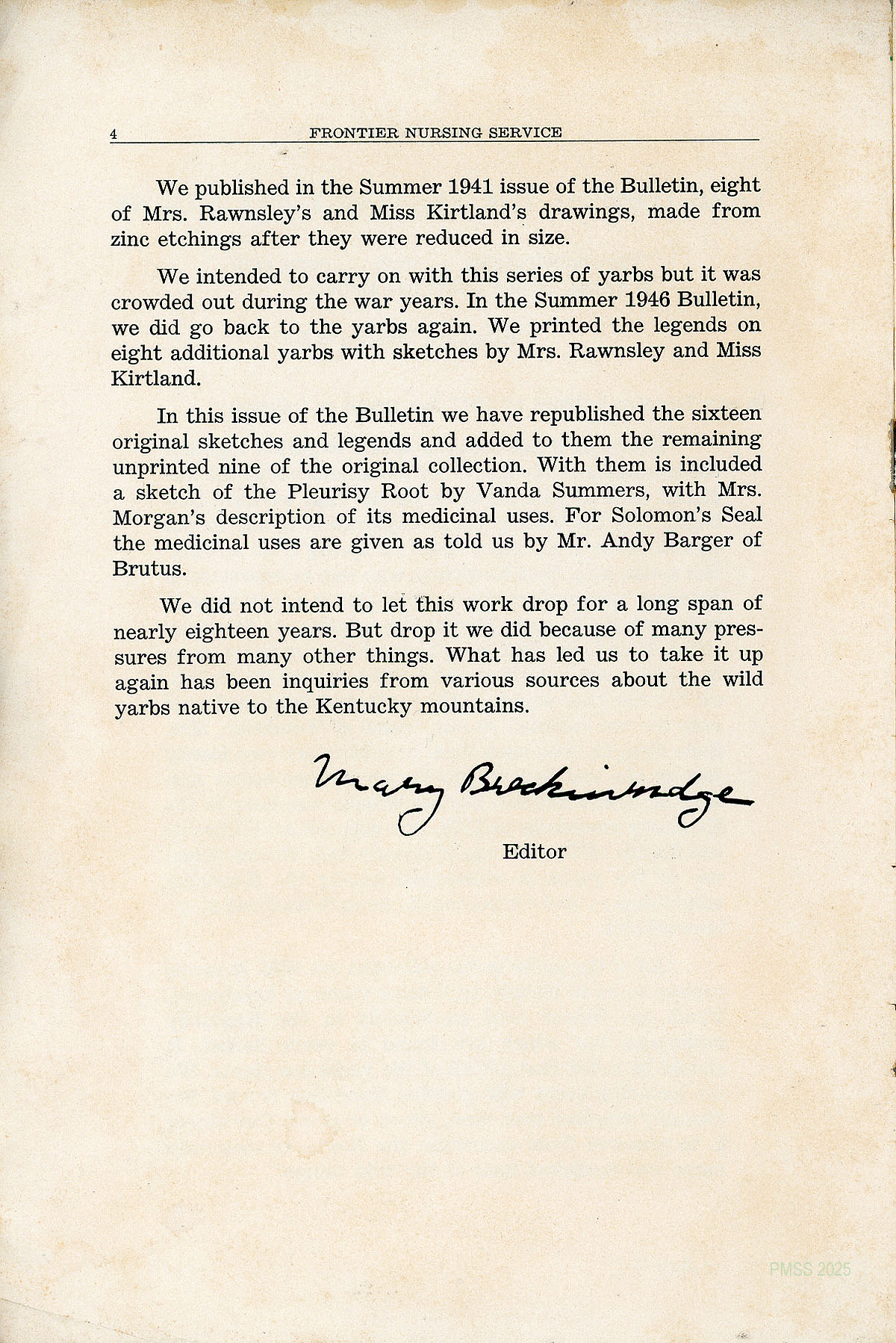 TAGS: Quarterly Frontier Nursing Service Bulletin, Frontier Nursing Service, Mary Breckinridge, Katherine Pettit, health issues of eastern Kentuckians, drawings by Mrs. Noel Rawnsley and Miss Leila Kirtland, yarbs, Miss Belle Morgan, Dorcas Wilson Cornett, medicinal plants