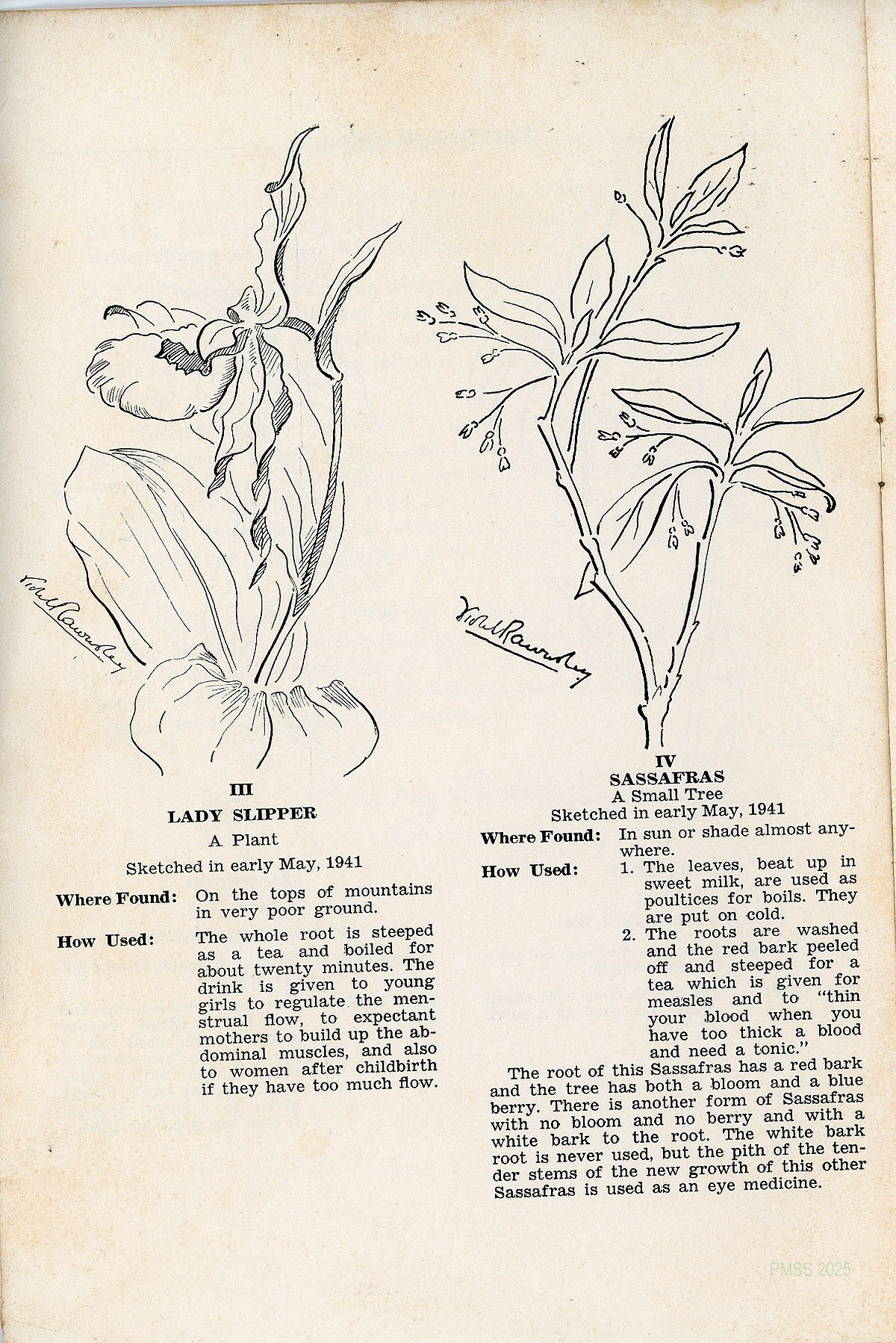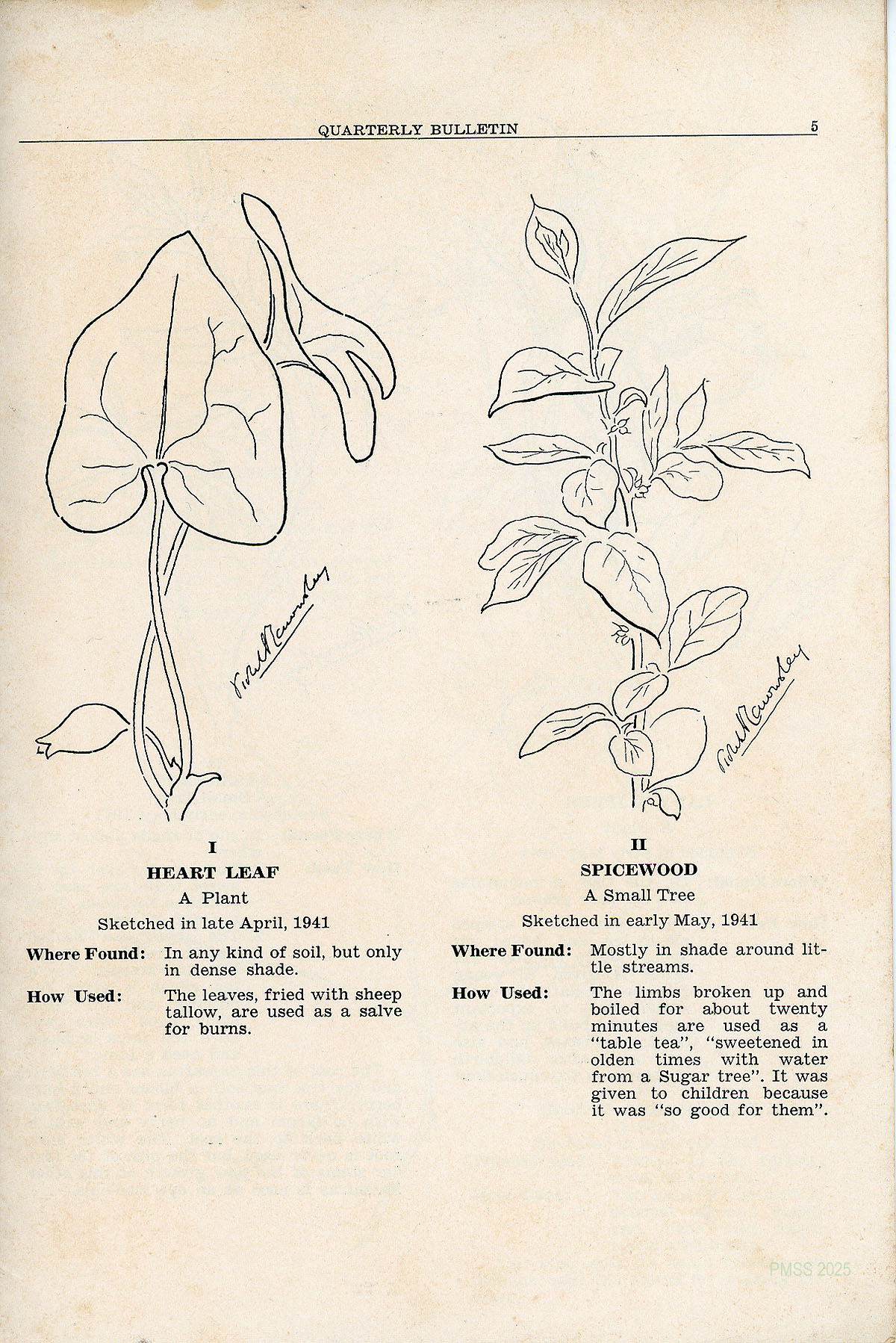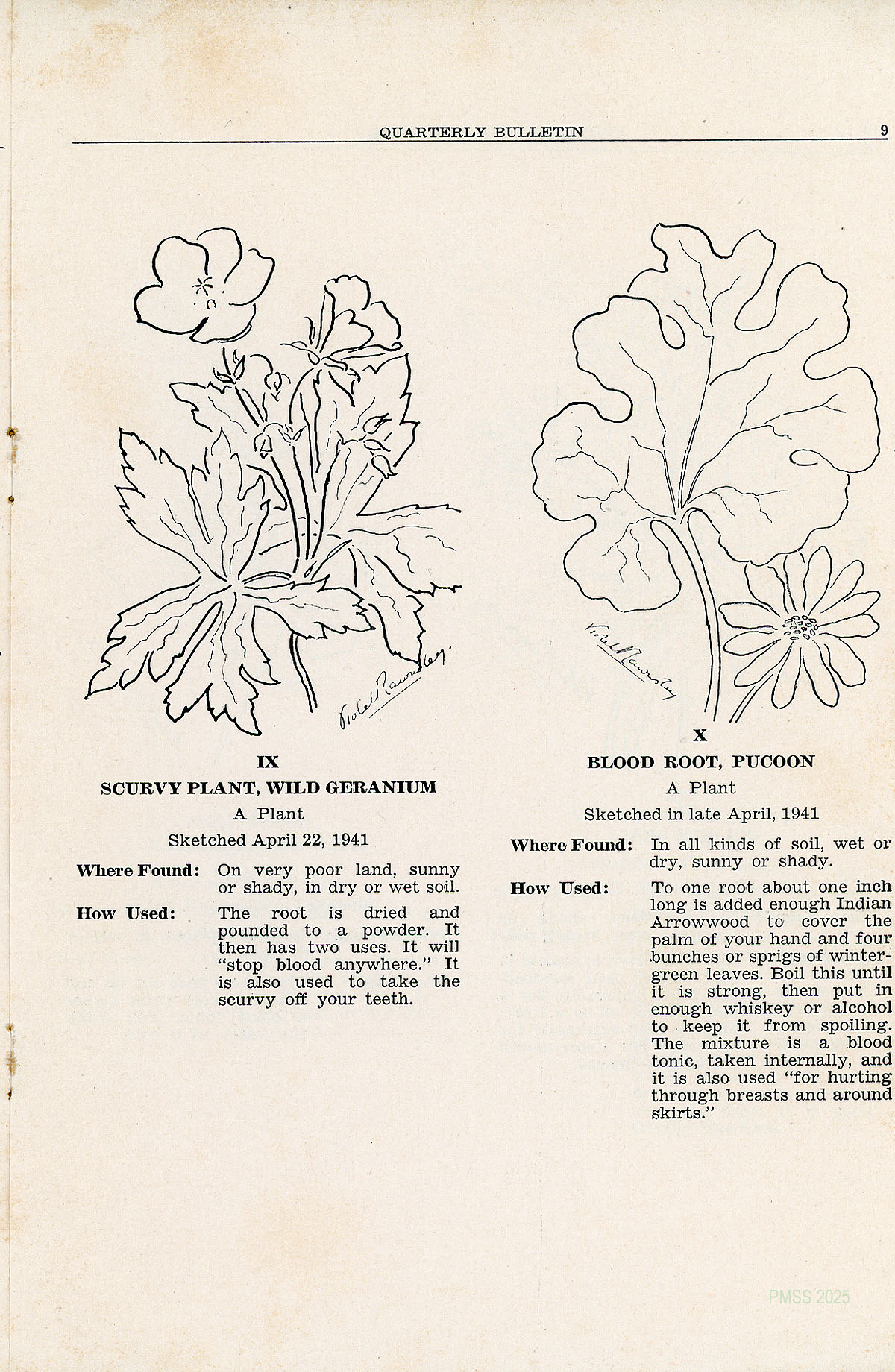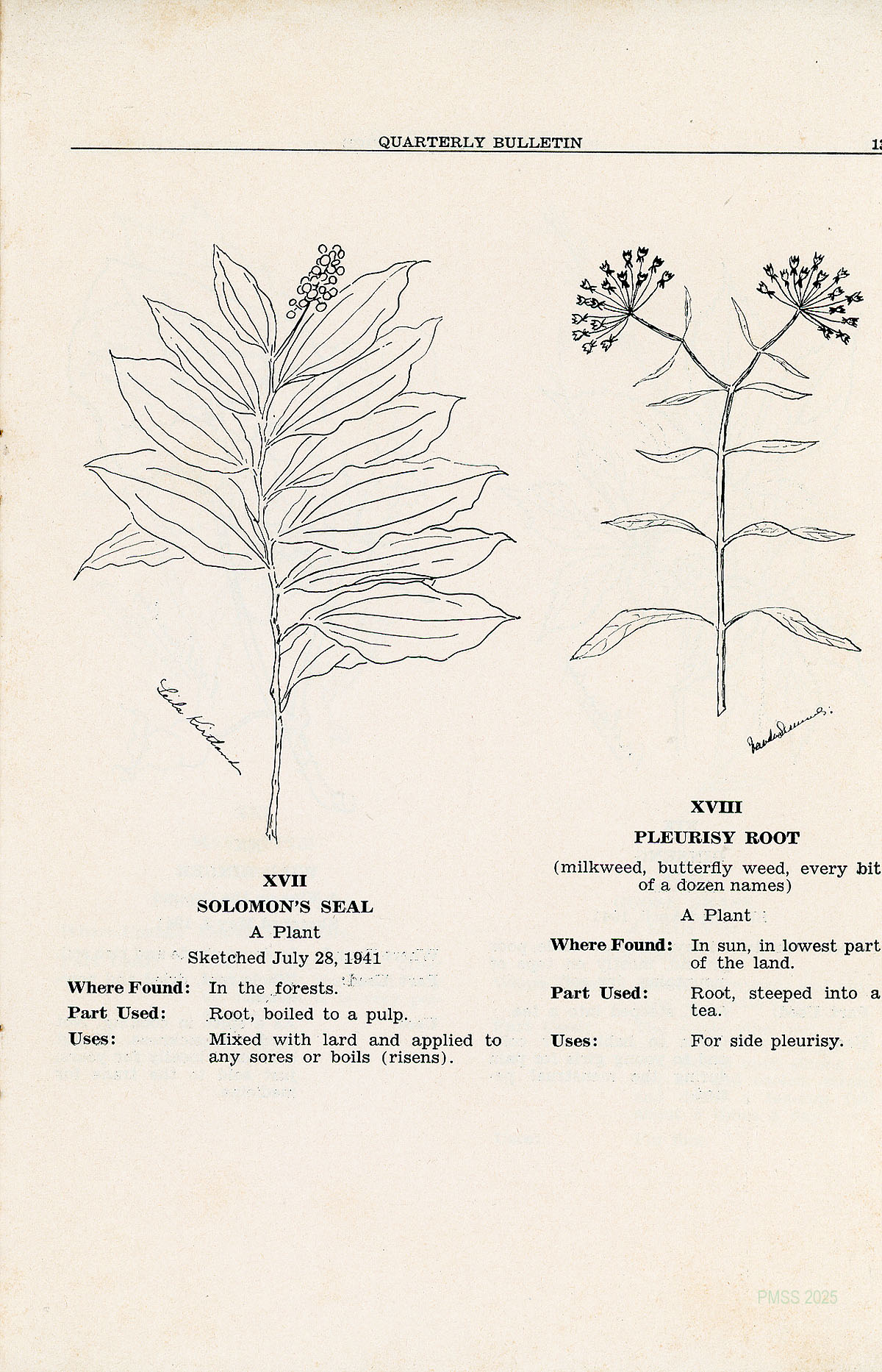 In this issue of the Bulletin we have republished the sixteen original sketches and legends and added to them the remaining unprinted nine of the original collection. With them is included a sketch of the Pleurisy Root by Vanda Summers, with Mrs. Morgan’s description of its medicinal uses. For Solomon’s Seal the medicinal uses are given as told us by Mr. Andy Barger of Brutus.