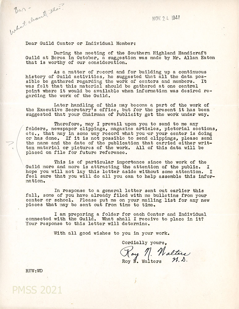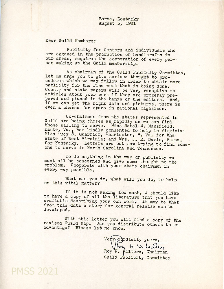 [001] August 5, 1941. Letter to Guild Members from Roy N. Walters, Chairman, Guild Publicity Committee, Berea, KY.  Walters urges members to “give serious thought” to procedures in obtaining more publicity for their handicrafts; asks for cooperation with their state chairman; names those who have consented to help in Virginia, West Virginia, and Kentucky; sending letters to recruit others in North Carolina and Tennessee. Requests literature about the members’ work for a possible story for general release. Encloses a revised Guild Map.