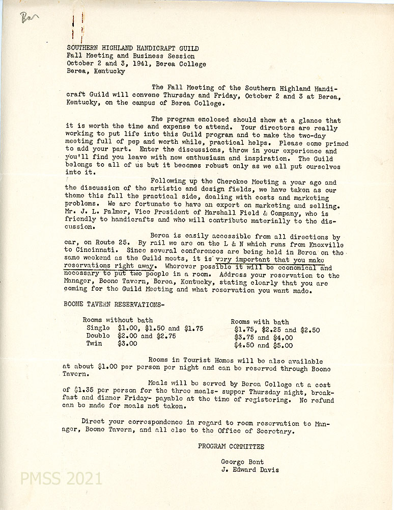[002] Announcement of the October 2 and 3, 1941 Fall Meeting and Business Session of the Southern Highland Handicraft Guild, Berea College, Berea, KY. The program is enclosed. The theme of this meeting will be “the practical [side], dealing with costs and marketing problems.” Mr. J.L. Palmer, VP of Marshall Field & Co., will contribute to the discussion. Gives directions to Berea by car or rail (L&N, which runs from Knoxville to Cincinnati) and instructions and prices for registering at Boone Tavern or “rooms in Tourist Homes.” From Program Committee (George Bent and J. Edward Davis).