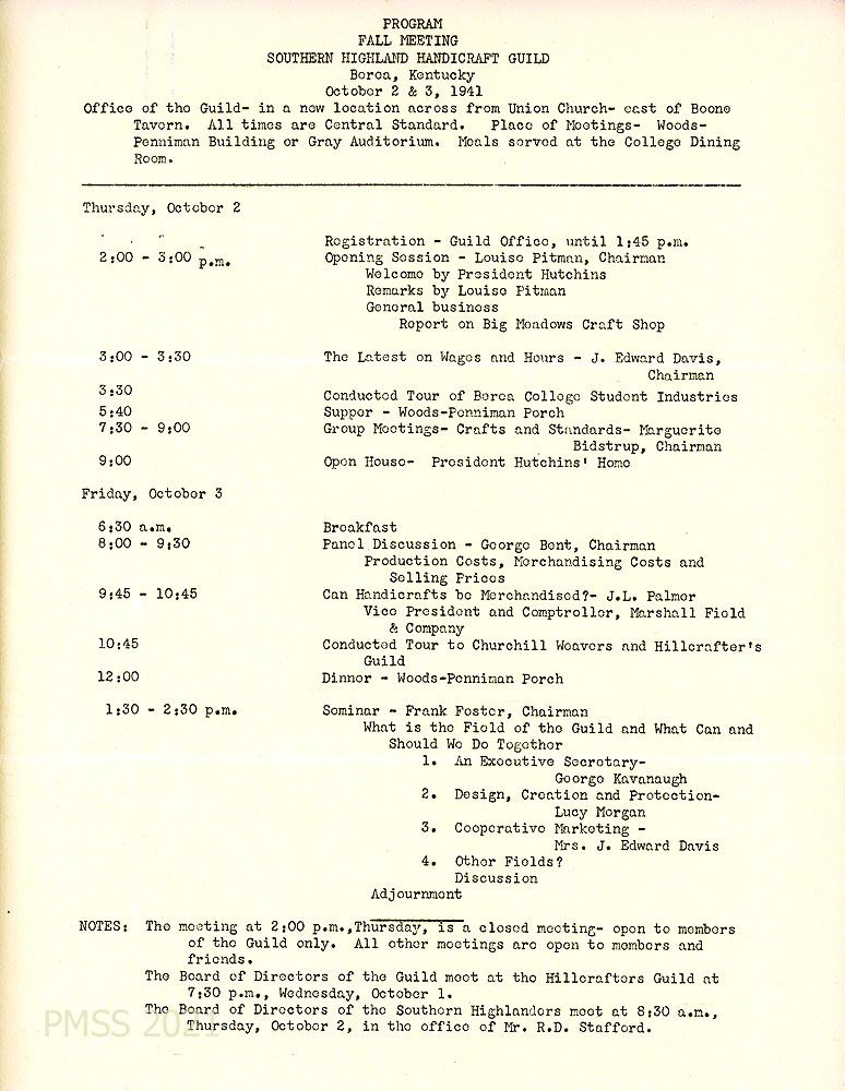 [003] Program for the fall meeting of the Southern Highland Handicraft Guild, Berea, Kentucky, October 2 and 3, 1941. Thursday, October 2, agenda includes a welcome by President Hutchins; report on Big Meadows Craft Shop; “The Latest on Wages and Hours” by J. Edward Davis, Guild President; tour of Berea College Student Industries; group meetings of Crafts and Standards chaired by Marguerite [Butler] Bidstrup; Open House at President Hutchins’ home.