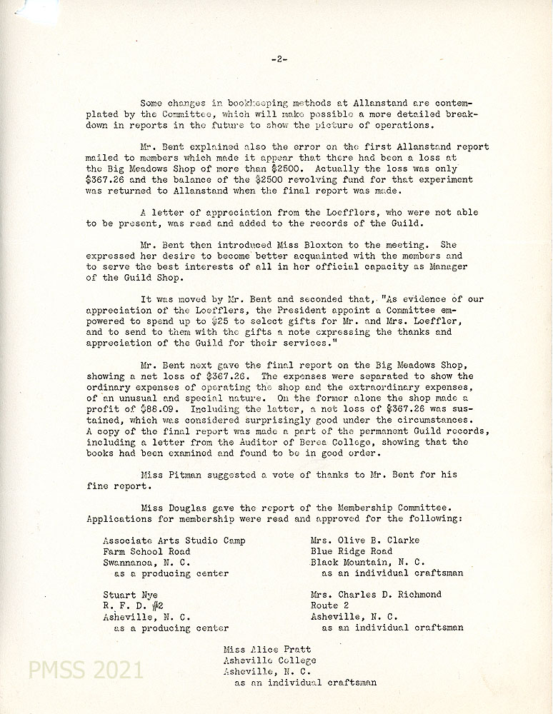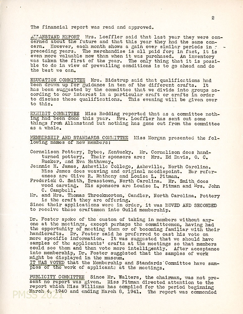 [002] Fall 1941 Minutes, page 2. Reports were presented by: Allanstand, Education Committee, Exhibit Committee, Publicity Committee, and the Membership and Standards Committee which reported new members, their address, crafts, and sponsors (“It was voted that the Membership and Standards Committee present samples of the work of applicants at the meetings.”)