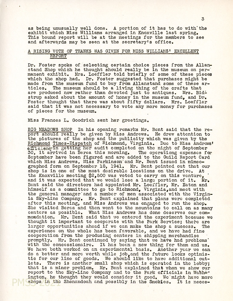 [003] Fall 1941 Minutes, page 3. The group discussed displaying “certain choice pieces from the Allanstand Shop in the museum on permanent exhibit.” Presentation of reports continued: Big Meadows Shop. (The Guild had entered into a venture with the shop “because we thought it important to cooperate with the Park Service; there are larger opportunities ahead if we can make the shop a success.”)