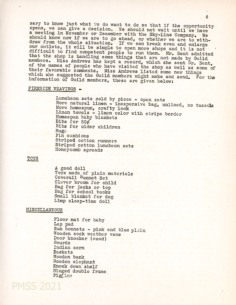 [004] Fall 1941 Minutes, page 4. Continuation of the report on Big Meadows Shop, listing new things that Guild members might make and send to the shop.