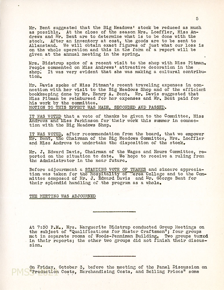 Other issues were discussed: The old mill at Russelville, the need for more attention to publicity,and panel discussions on “Production, Merchandising and Selling Costs.” J.L. Palmer of Marshall Field and Company spoke on “Can Handicrafts Be Merchandised.”