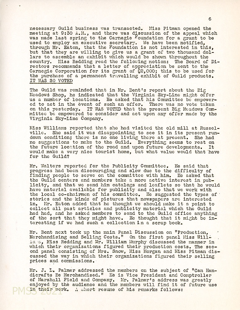 [006] Fall 1941 Minutes of the Guild business meeting, page 6. It was voted that “a letter of appreciation be sent to the Carnegie Corporation for its grant of $2,000…to purchase a permanent travelling exhibit of Guild products.”