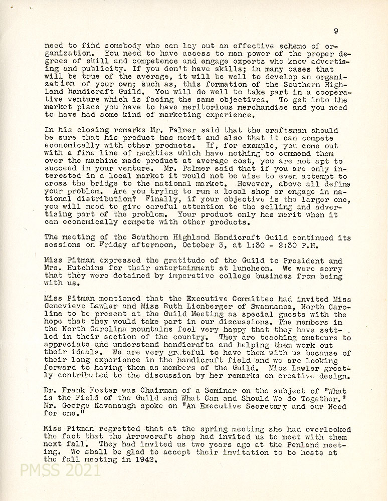 [009] Fall 1941 Minutes of the Guild business meeting, page 9. Continued summary of Palmer’s talk and closing remarks. Special guests from Swannanoa, NC, were welcomed to be part of the discussions.