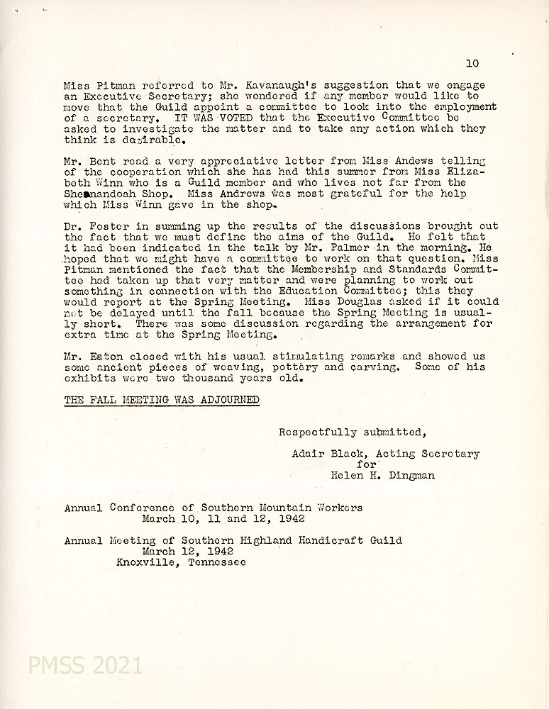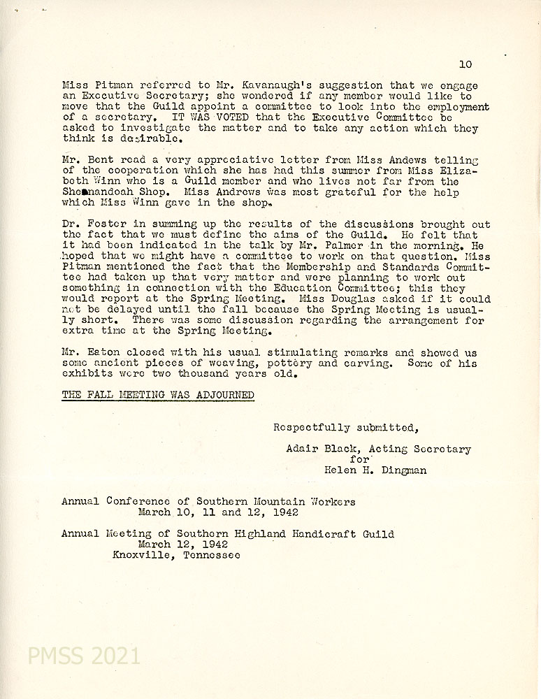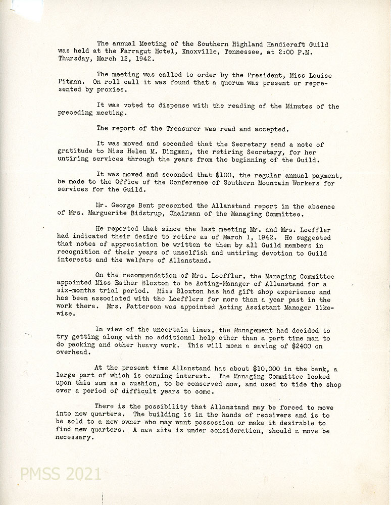 [019] March 12, 1942. Page 1 of minutes of the annual meeting of the Southern Highland Handicraft Guild, Knoxville, TN. President: Miss Louise Pitman. “It was moved and seconded that the Secretary send a note of gratitude to Miss Helen M. (sic) Dingman, the retiring Secretary for her untiring services through the years from the beginning of the Guild.” Also, it was moved that $100 annual payment “be made to the Office of the Conference of Southern Mountain Workers for services for the Guild.” New appointments were made for Acting-Manager and Assistant Manager of Allenstand. Other Allenstand issues were covered.