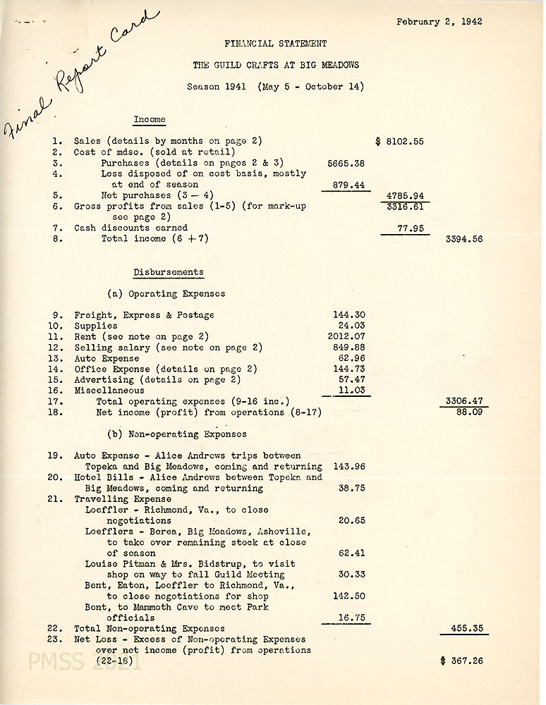 [012] February 2, 1942. Page 1 of “Financial Statement – The Guild Crafts at Big Meadows, Season 1941 (May 5 – October 14),” showing income and disbursements.
