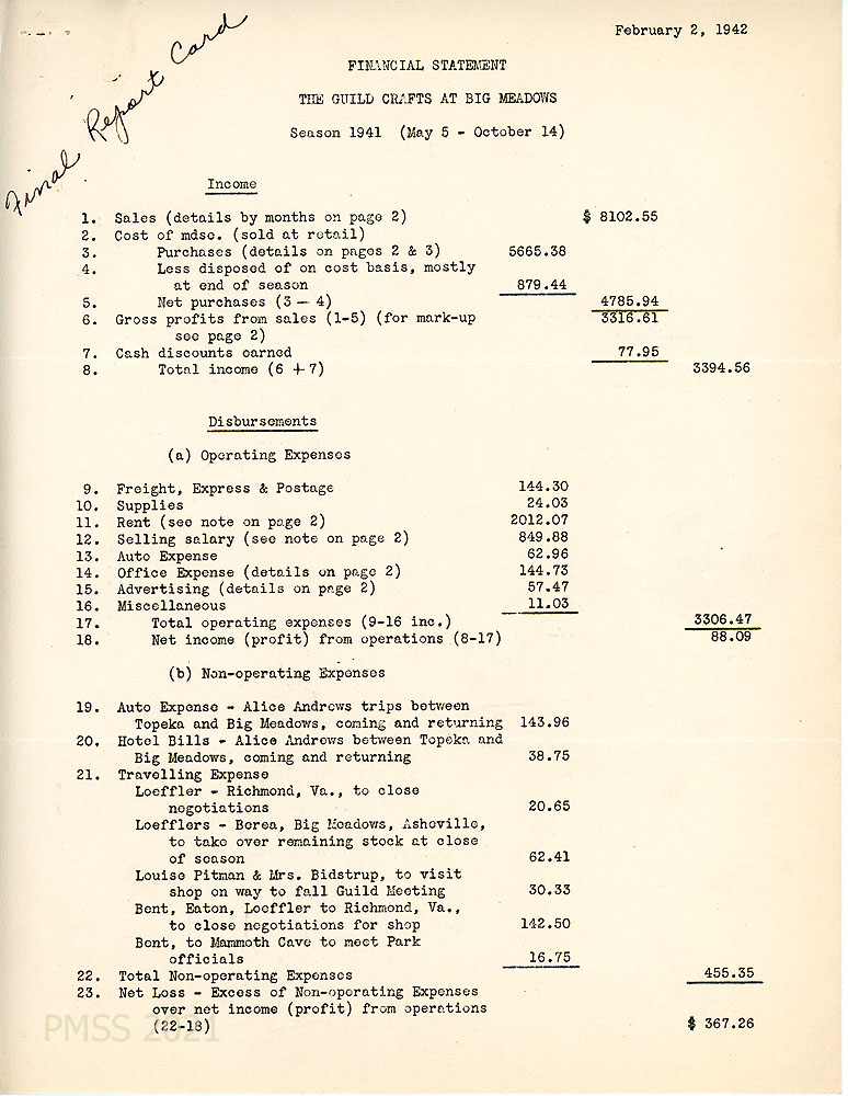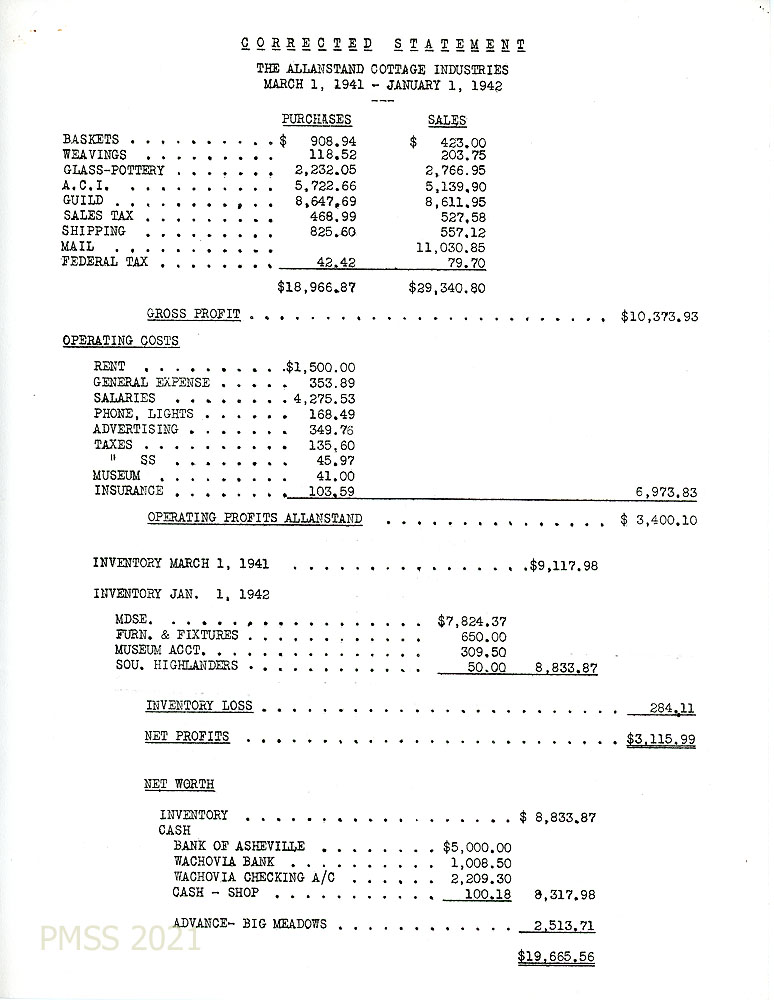 [018] March 2, 1941 – January 1, 1942, Corrected Statement for The Allanstand Cottage Industries, indicating purchases, sales, profits, operating costs, value of inventory, net worth.