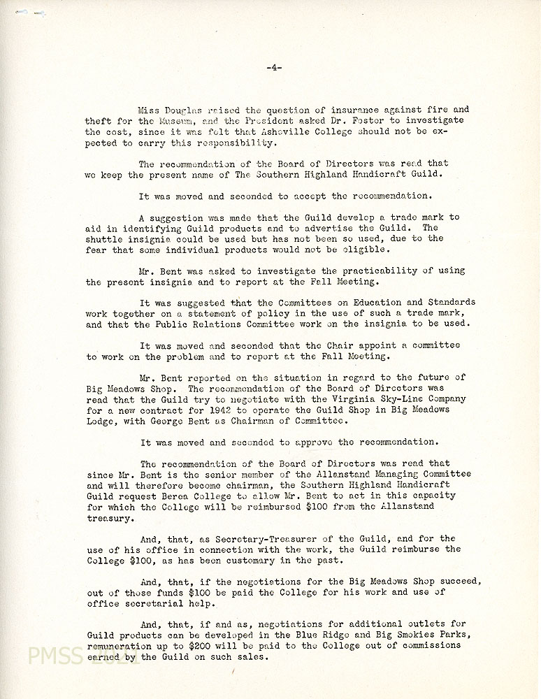 [022] Page 4 of minutes, March 12, 1942. Other discussions: fire and theft insurance for the museum; trademark for Guild products; use of the shuttle insignia; 1942 contract with Virginia Sky-Line Company to operate the Guild Shop in Big Meadows Lodge; as senior member of the Allanstand Managing Committee, he should become chairman and Berea College will be reimbursed $100 from the Allanstand treasury; other recommended remunerations.