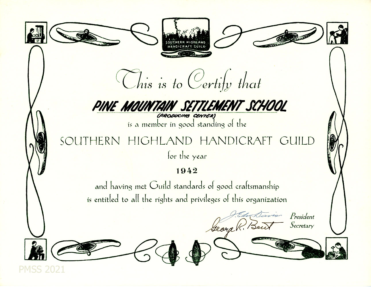 [025] 1942. A certificate stating that Pine Mountain Settlement School (producing Center) is a member of the Southern Highland Handicraft Guild for the year 1942. Signed by J. Edw. Davis, President, and George R. Bent, Secretary. Image: Decorative board showing sketches of shuttles, craftspeople at work and logo.
