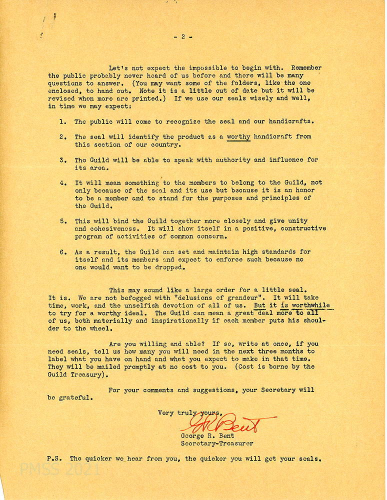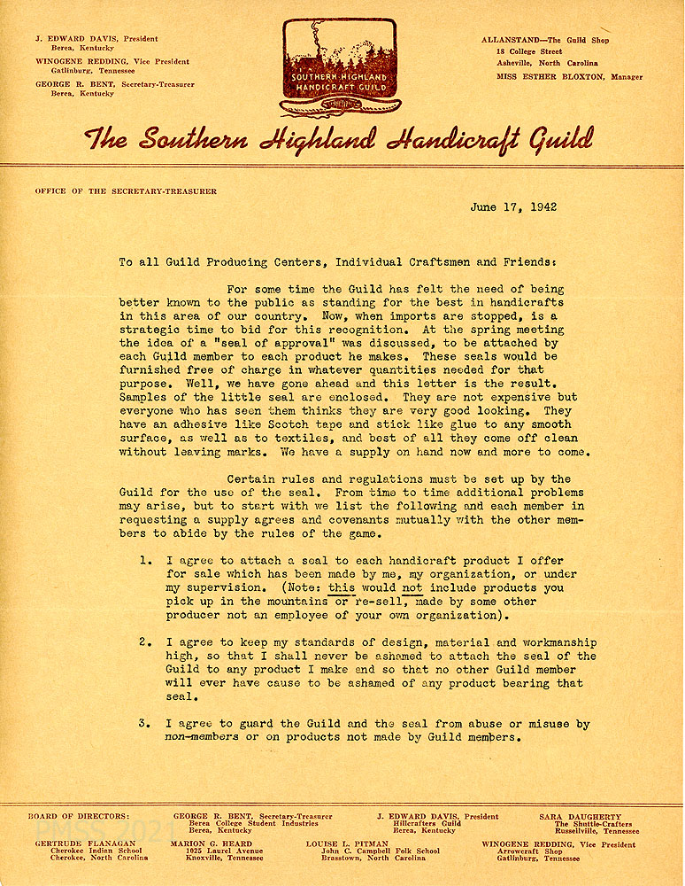 [026] June 17, 1942. Page 1 of letter to “All Guild Producing Centers, Individual Craftsmen and Friends” from George R. Bent, Secretary-Treasurer, on letterhead for The Southern Highland Handicraft Guild. “For some time the Guild has felt the need of being better known to the public as standing for the best in handicrafts in this area of our country. Now, when imports are stopped, is a strategic time to bid for this recognition.” Samples of “seals of approval” are enclosed for Guild members to attach to their products. The rules and regulations for use of the seal are listed. (See images of seals in Gallery above, #030).