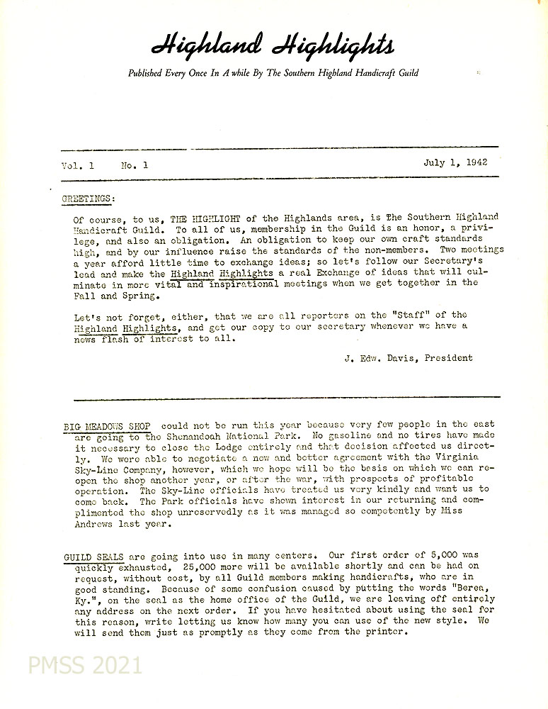 [028] July 1, 1942. Page 1 of newsletter: “Highland Highlights, Published Every Once In Awhile By the Southern Highland Handicraft Guild,” Vol. 1, No. 1. Greetings from J. Edw. Davis, President. Report from Big Meadows Shop, which “could not be run this year because very few people in the east are going to the Shenandoah National Park. No gasoline and no tires (due to WWII) have made it necessary to close the Lodge entirely and that decision affected us directly.”