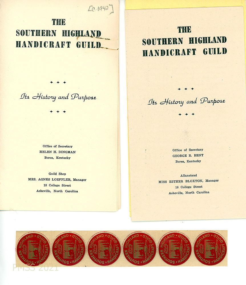 [030] C. 1942. Cover for pamphlet titled “The Southern Highland Handicraft Guild: Its History and Purpose.” Office of Secretary: Helen H. Dingman, Berea, KY. Guild Shop: Mrs. Agnes Loeffler, Manager…Asheville, NC.