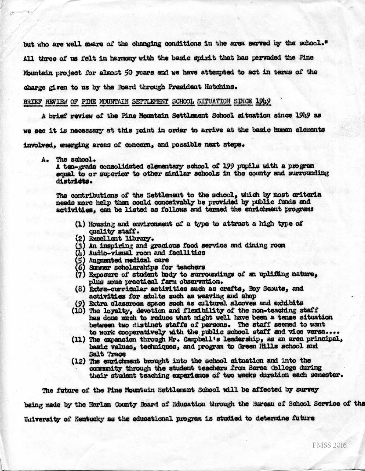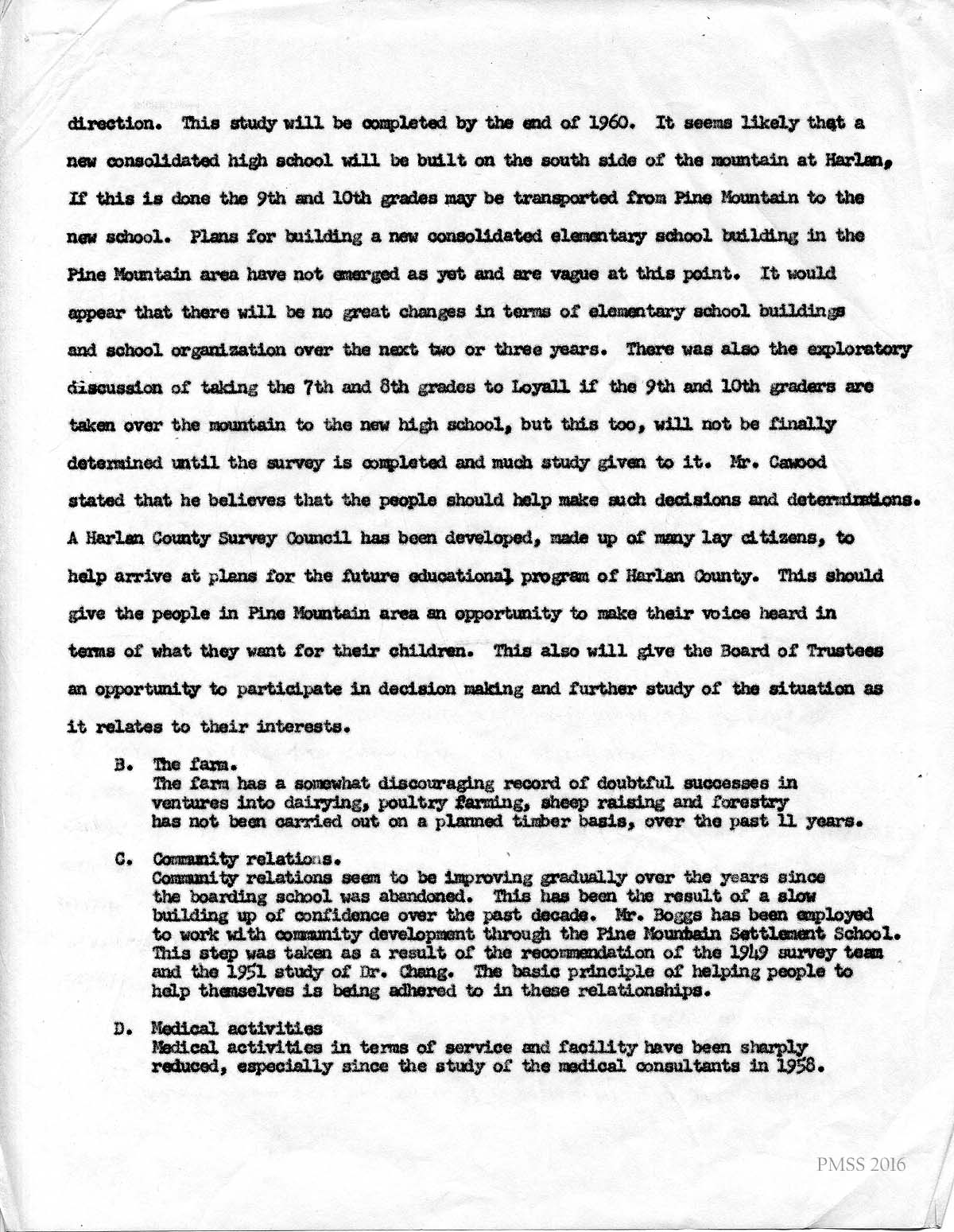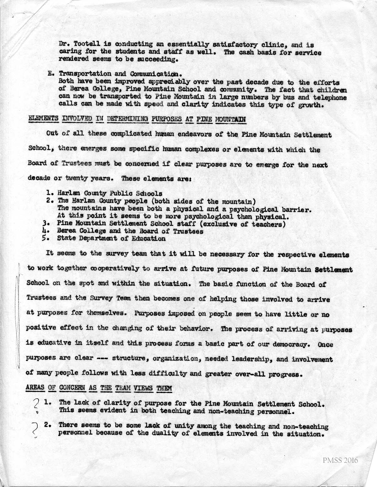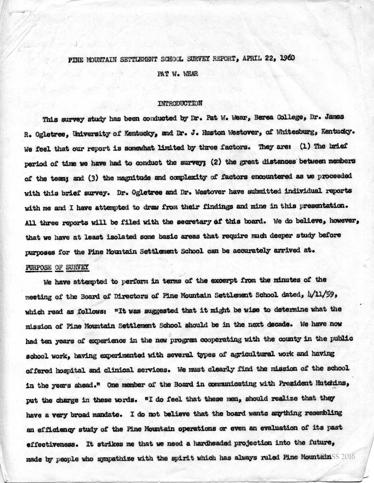Requested by the Board of Pine Mountain Settlement School and completed by Berea College faculty member, Dr. Pat W. Wear, the Pine Mountain Settlement School Survey Report of April 22, 1960, was an attempt to review the progress of the School following the closure of the boarding school in 1949. The report was undertaken by Dr. Wear at the suggestion of the PMSS Board of Trustees who indicated that “…it might be wise to determine what the mission of Pine Mountain Settlement School should be in the next decade …we must clearly find the mission of the school in the years ahead.”