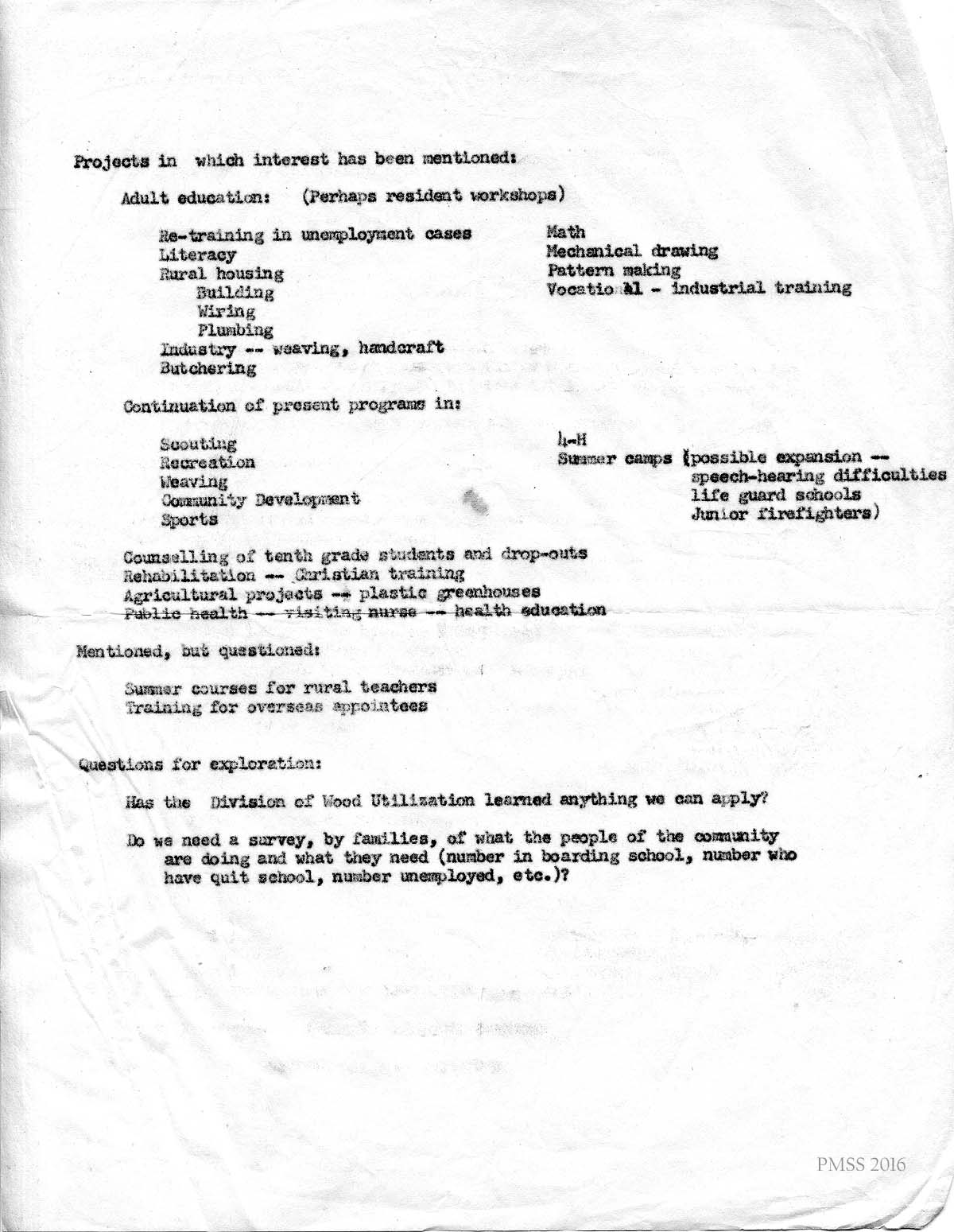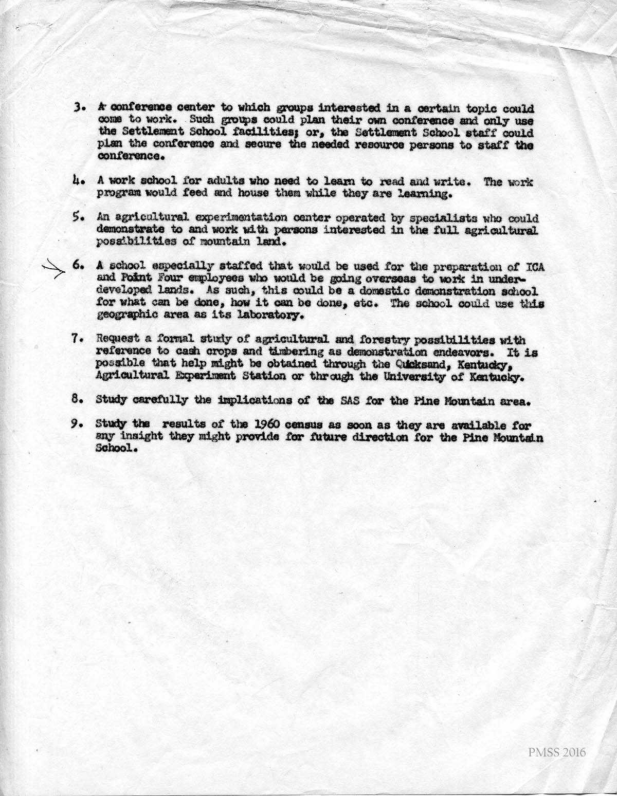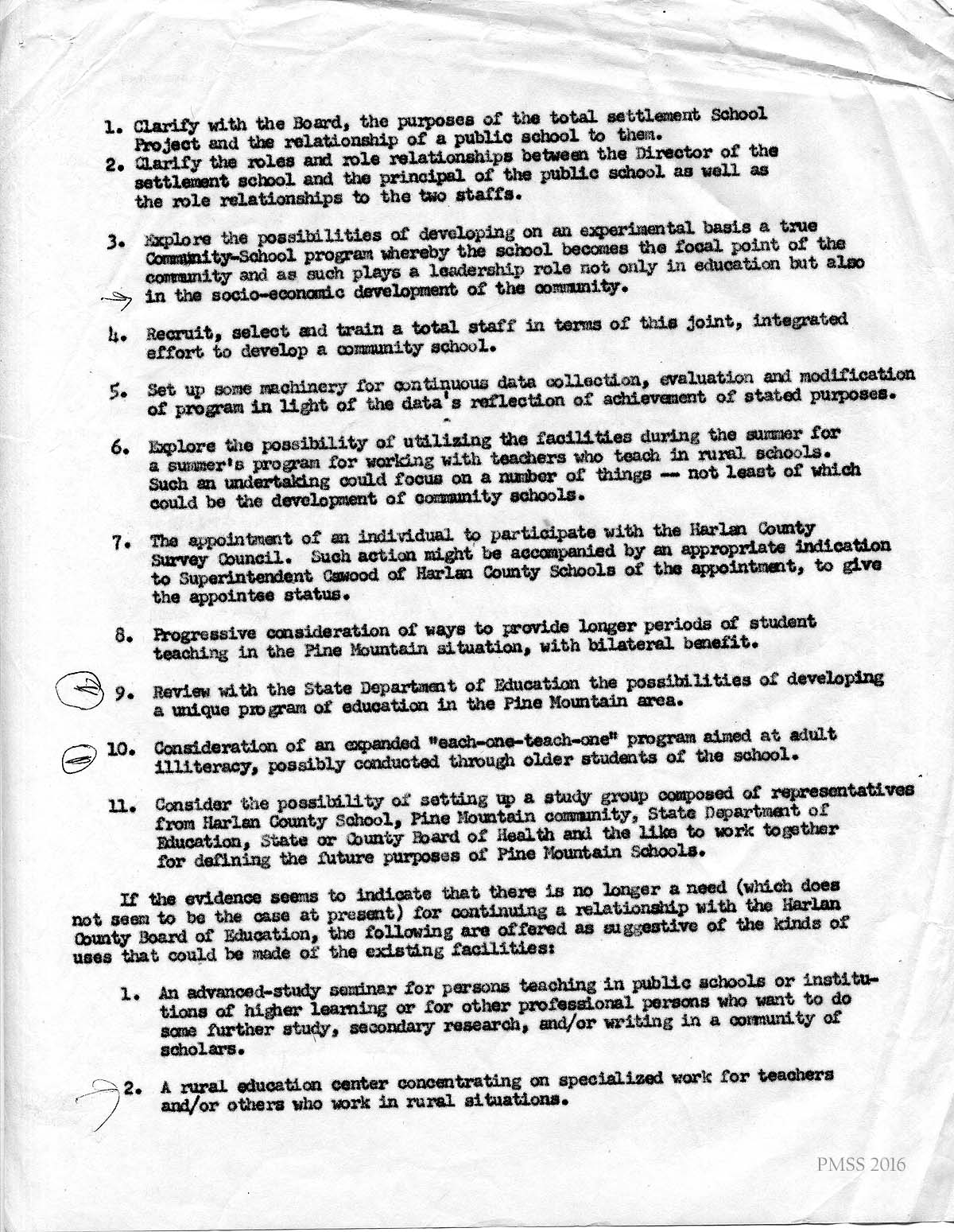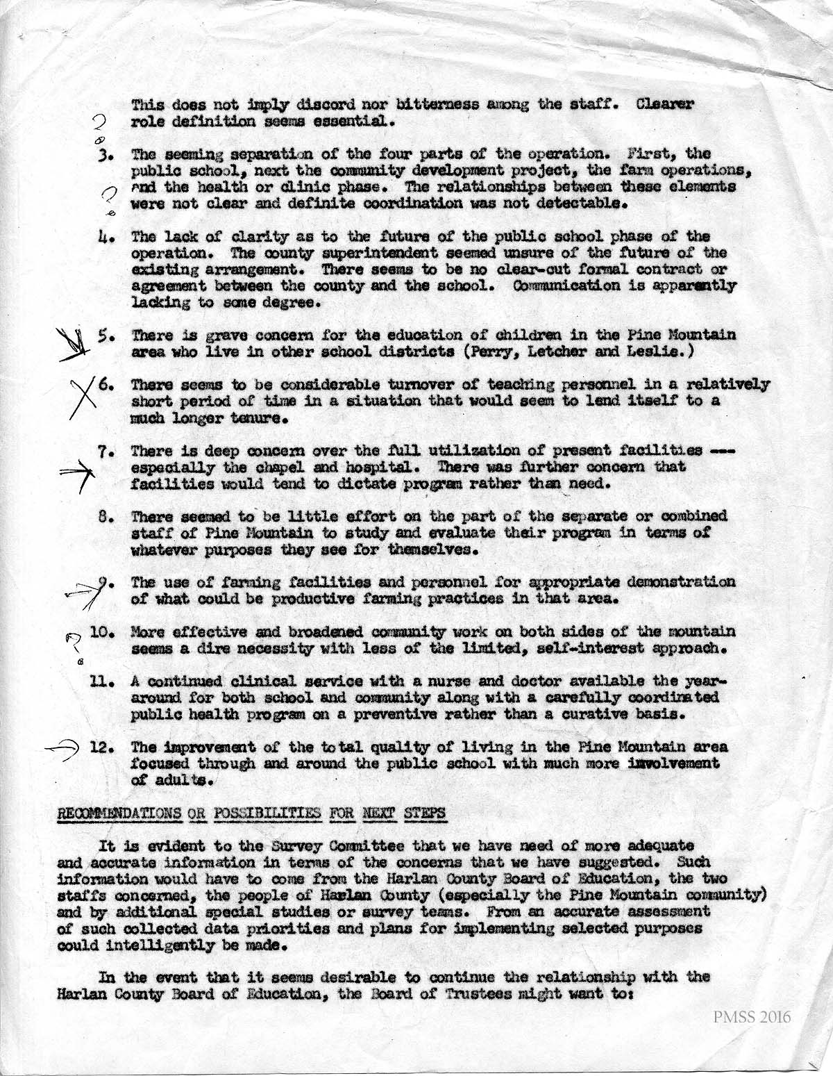 Requested by the Board of Pine Mountain Settlement School and completed by Berea College faculty member, Dr. Pat W. Wear, the Pine Mountain Settlement School Survey Report of April 22, 1960, was an attempt to review the progress of the School following the closure of the boarding school in 1949. The report was undertaken by Dr. Wear at the suggestion of the PMSS Board of Trustees who indicated that “…it might be wise to determine what the mission of Pine Mountain Settlement School should be in the next decade …we must clearly find the mission of the school in the years ahead.”