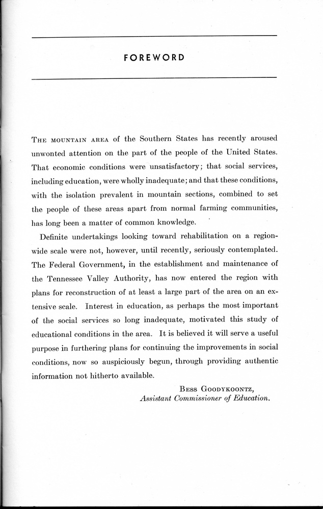 Definite undertakings looking toward rehabilitation on a region-wide scale were not, however, until recently, seriously contemplated. The Federal Government, in the establishment and maintenance of the Tennessee Valley Authority, has now entered the region with plans for reconstruction of at least a large part of the area on an extensive scale. Interest in education, as perhaps the most important of the social services so long inadequate, motivated this study of educational conditions in the area. It is believed it will serve a useful purpose in furthering plans for continuing the improvements in social conditions, now so auspiciously begun, through providing authentic information not hitherto available.