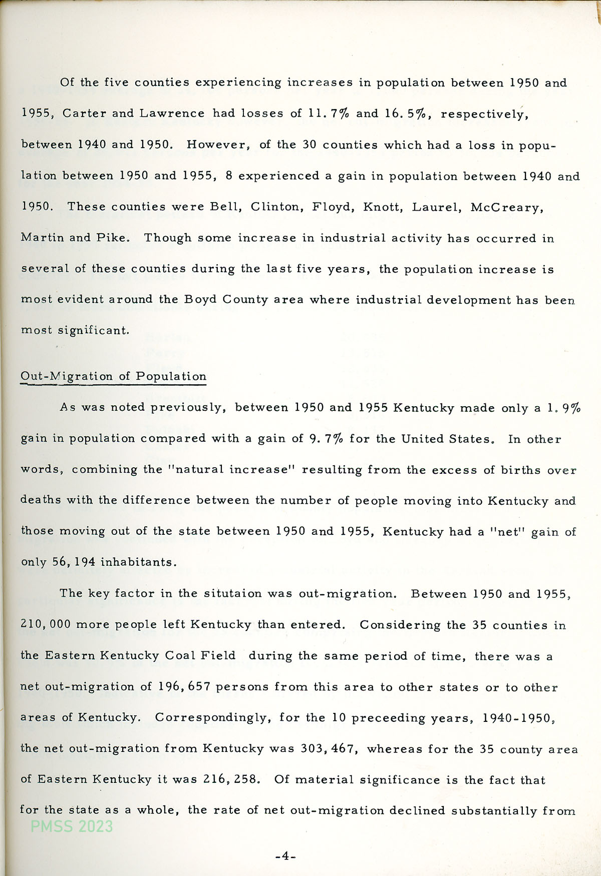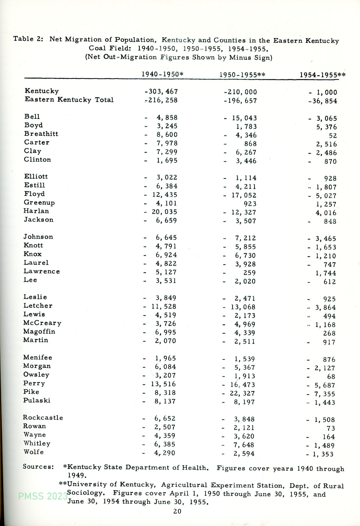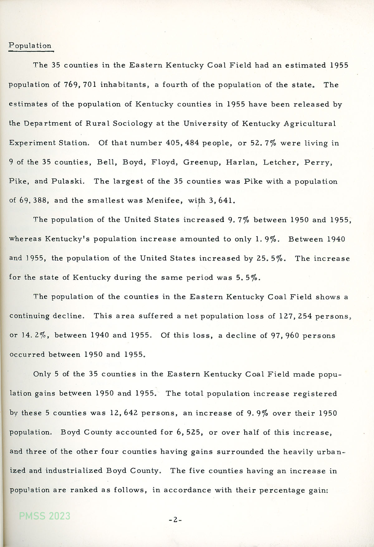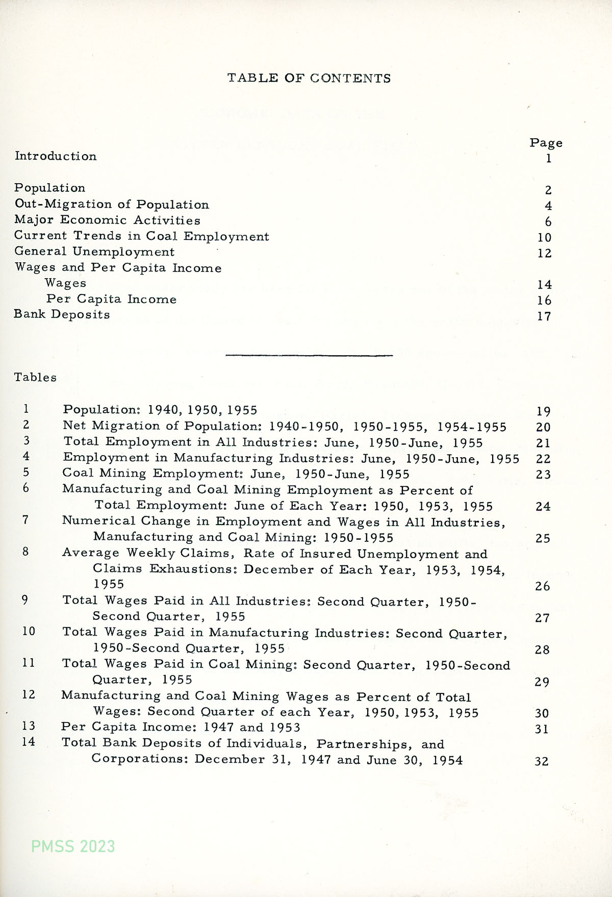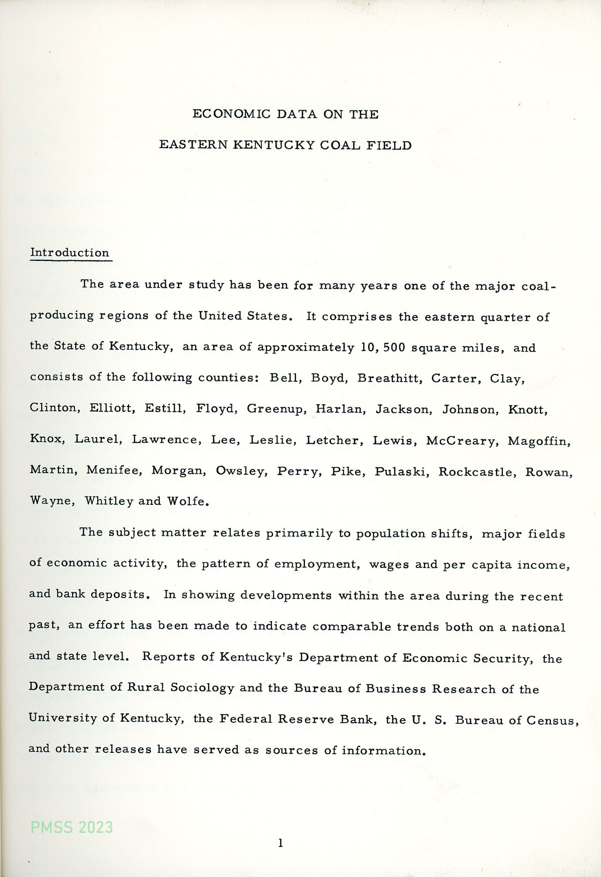 TAGS: Studies, surveys, reports, 1956, Eastern Kentucky coal field, coal mining, economic data, demographics, population shifts, economic activity, patterns of employment, wages, per capita income, bank deposits, Bureau of Business Research, U.S. Census Bureau, UK Department of Economic Security, UK Department of Rural Sociology, Federal Reserve Bank, population studies, rural sociology, population out-migration, economic activity