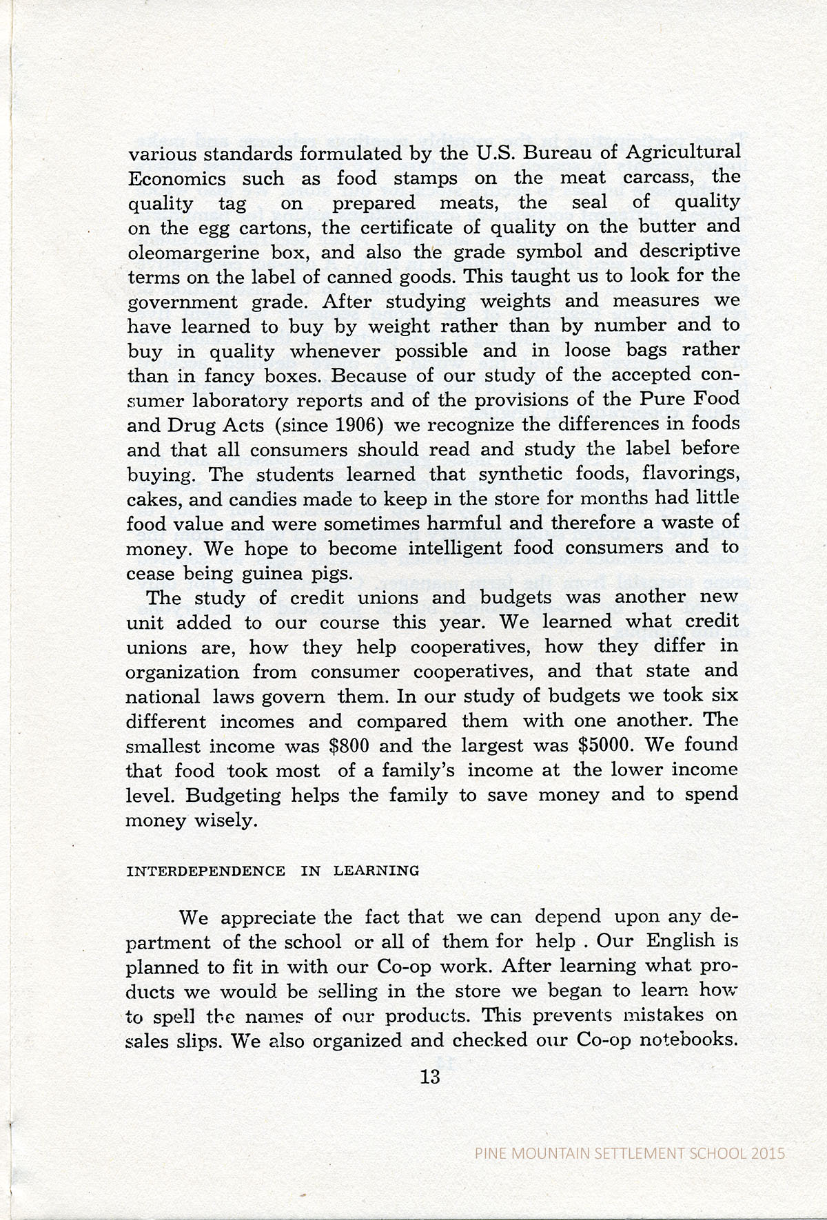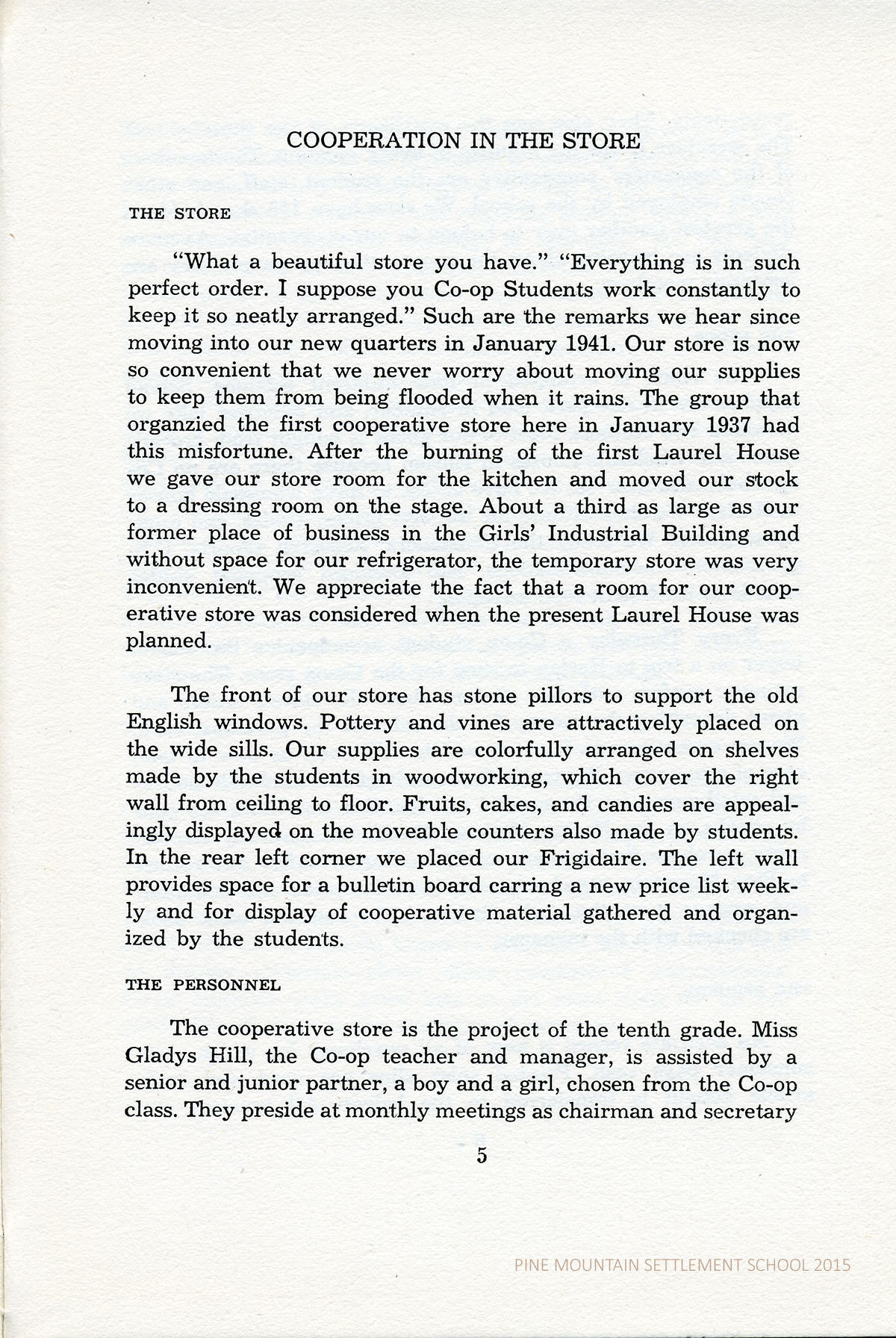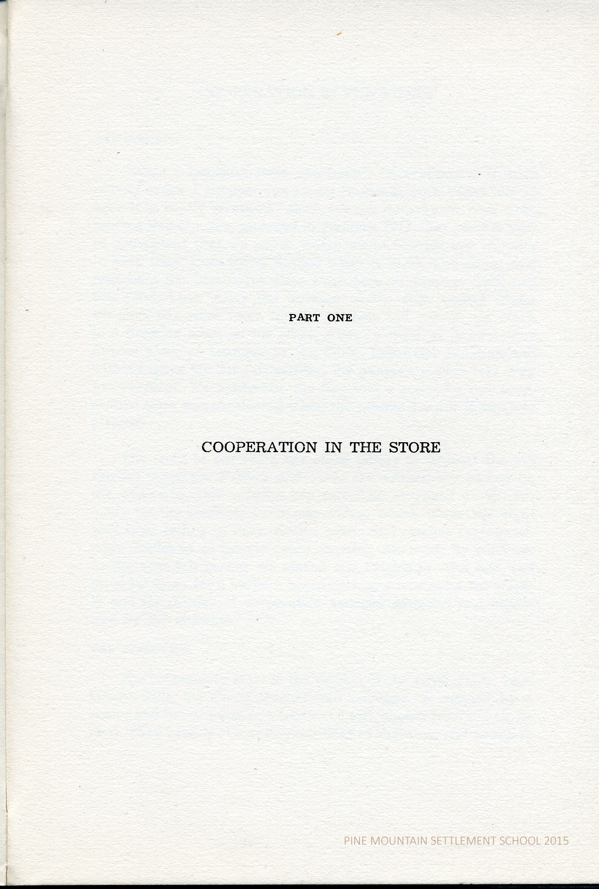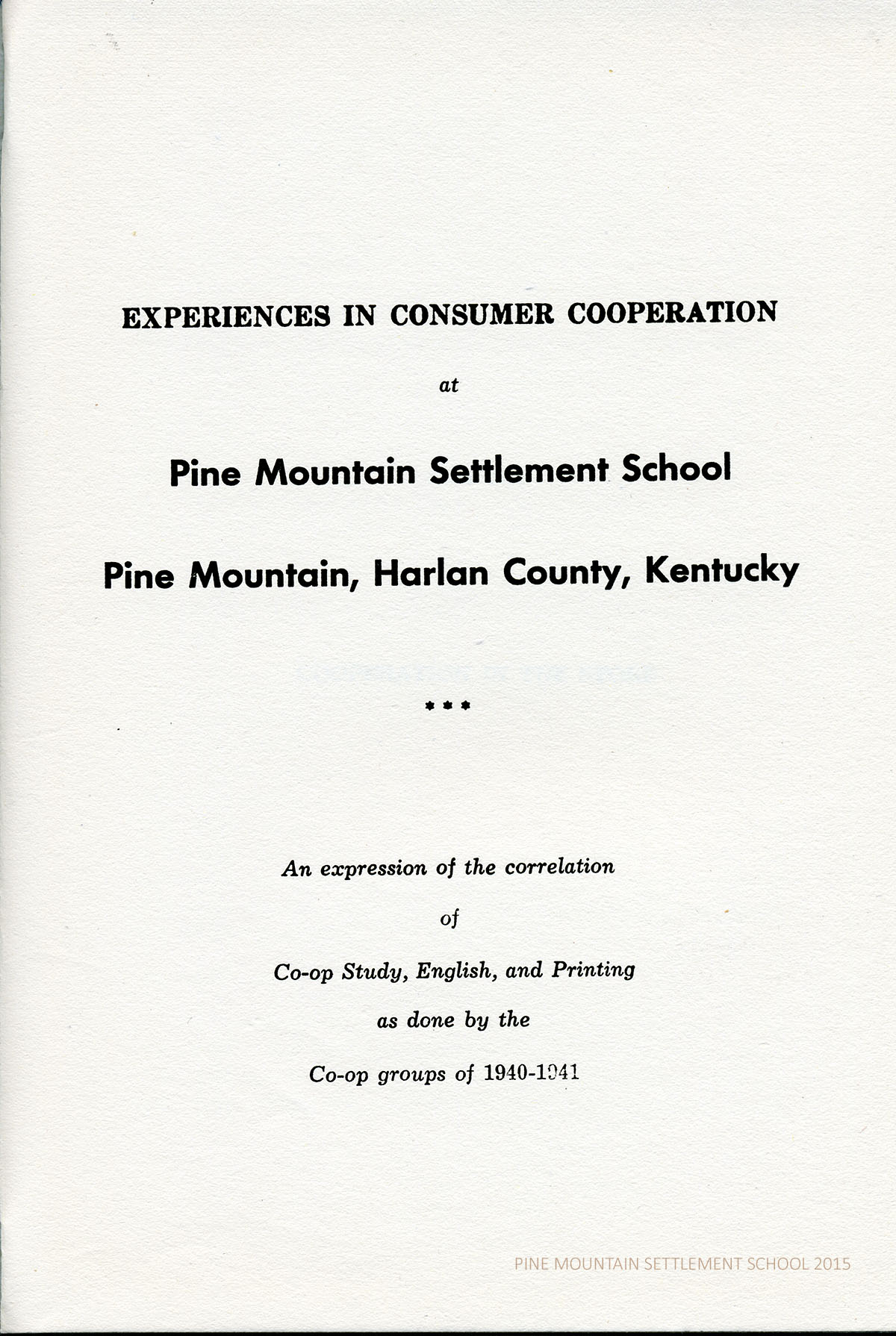 “Experiences in Consumer Cooperation” is a report by Co-op students on their studies and operation of Cooperative program at Pine Mountain Settlement School during the period of the school year 1940-1941. The subtitle of the report, “An expression of the correlation of Co-op Study, English, and Printing as done by the Co-op groups of 1940-1941,” reflects the goal of the program, interdependence in learning.