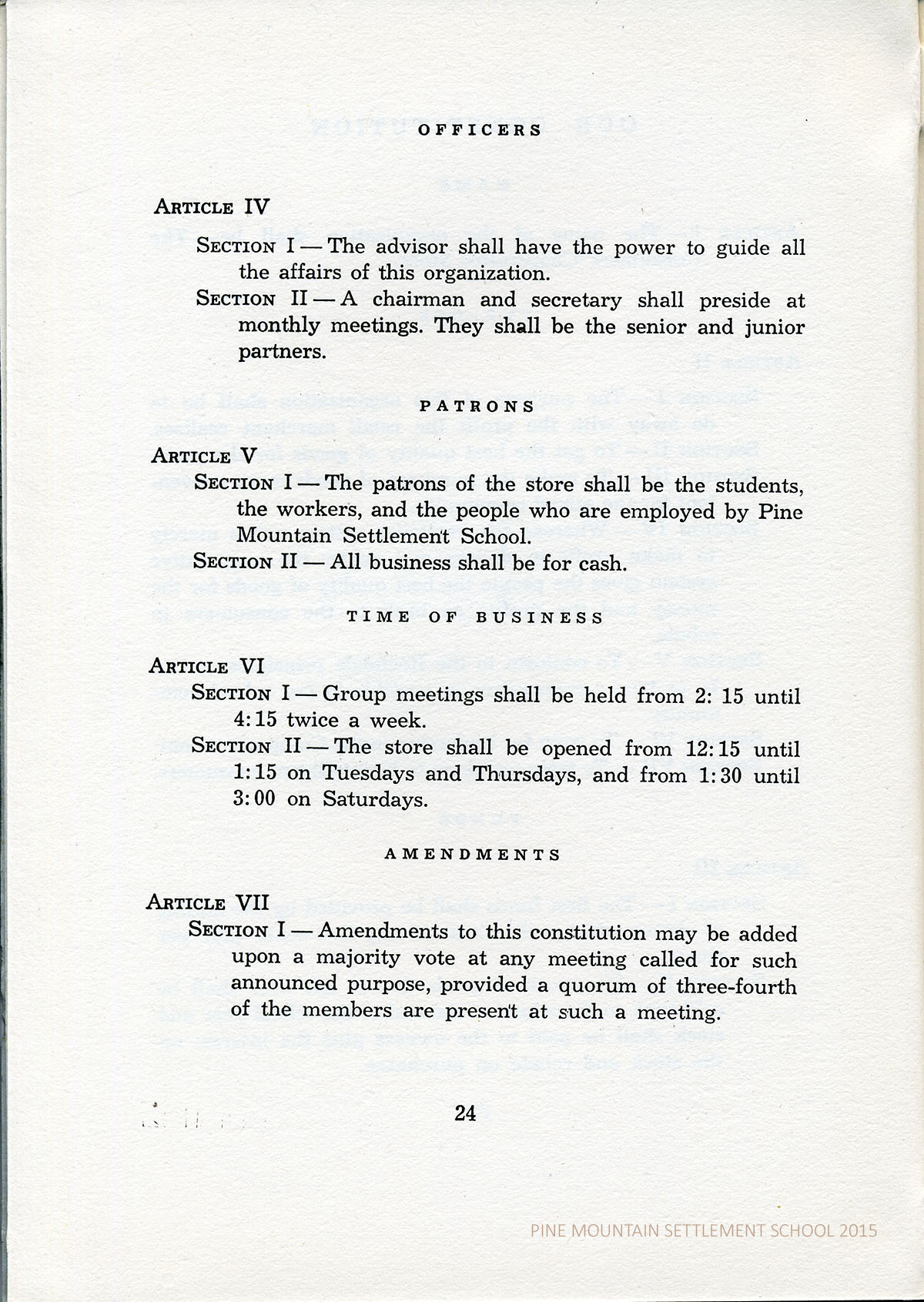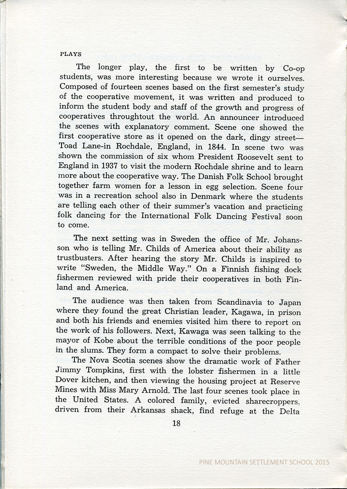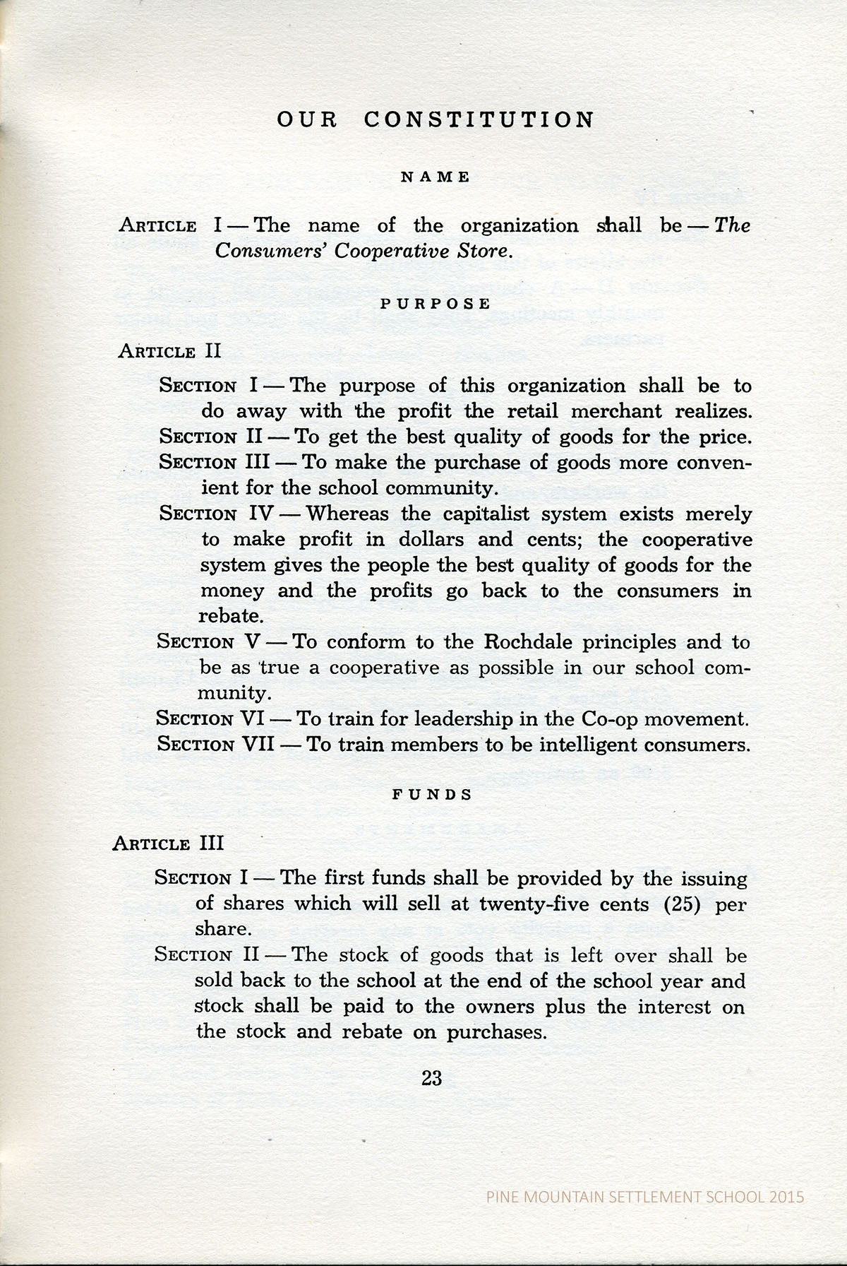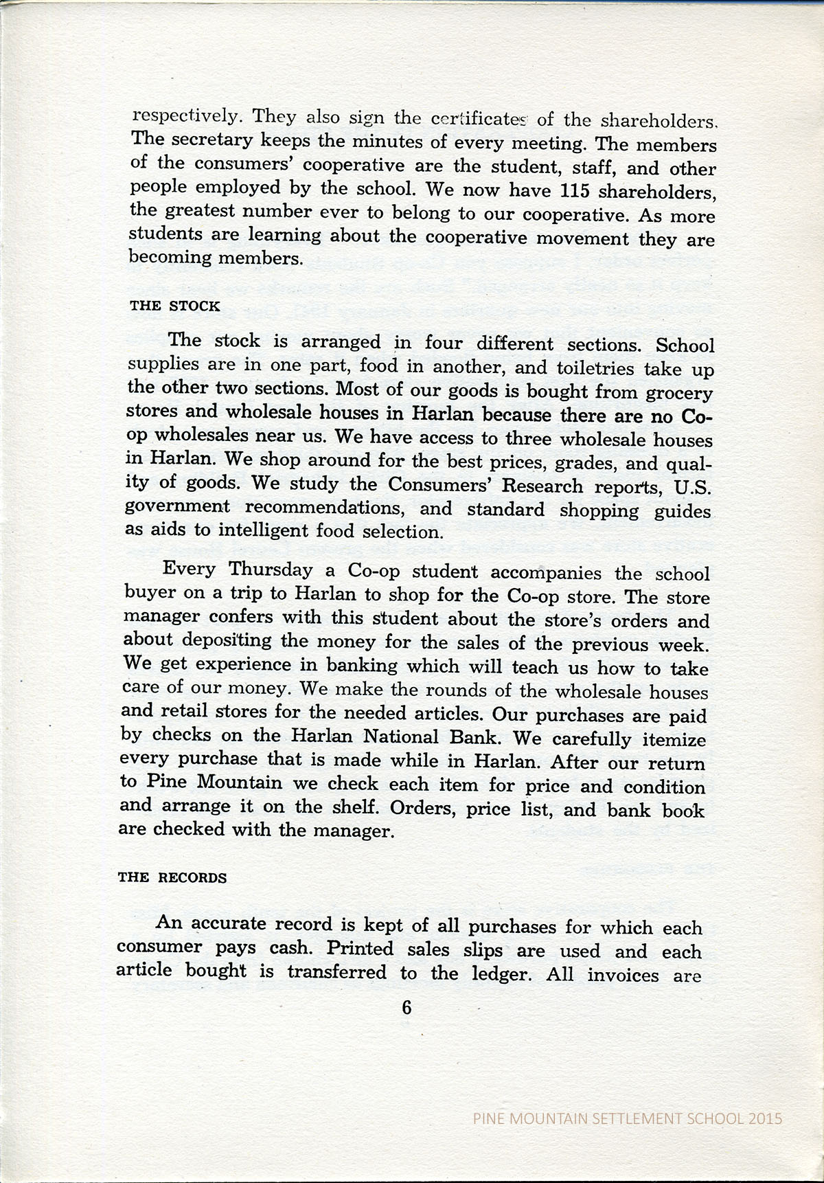 Not only do we study about our own cooperative store at Pine Mountain, but we study about cooperatives all over the world which are found in 47 different countries. From an understanding of the first cooperatives in England we passed to the Scandinavian countries. From there we went to Japan to learn about Kagawa. Cooperatives in Novia Scotia were interesting because of Dr. Coady, Father Tompkins, and the housing project for the miners. Cooperatives in the United States were studied thoroughly. We learned how they were organized and what they are doing. We have also learned that people can buy cooperatively, borrow money cooperatively, and produce goods cooperatively. Our cooperative store was organized for the purpose of buying cooperatively.