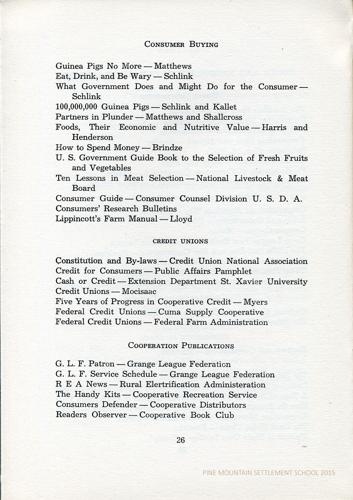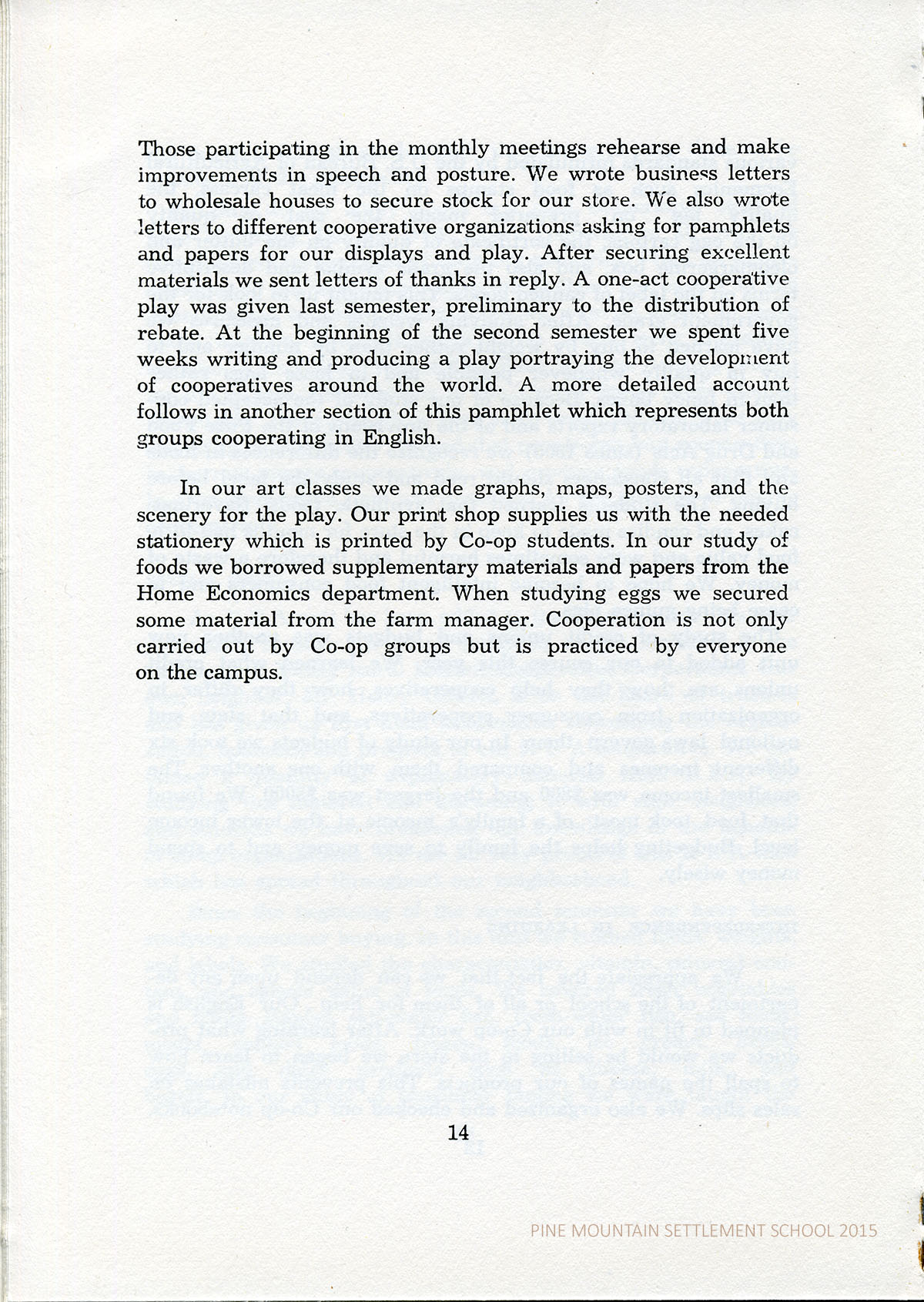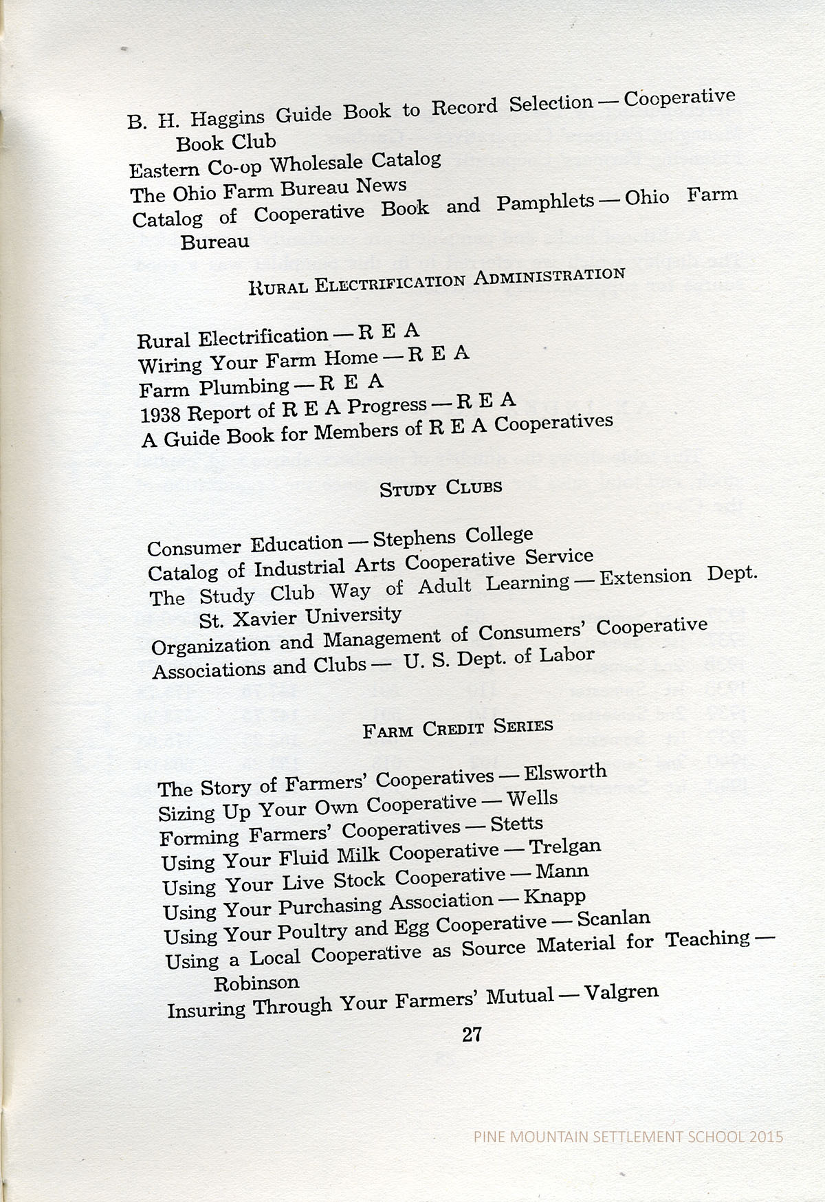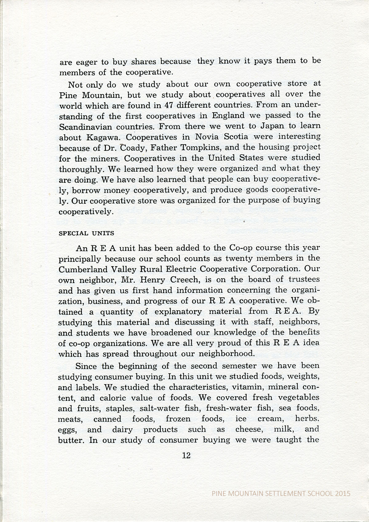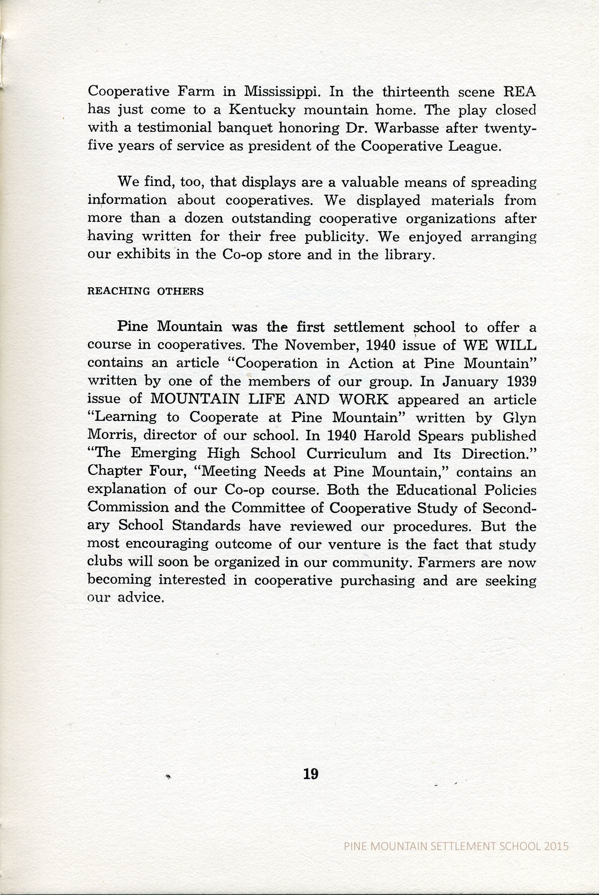 Pine Mountain was the first settlement school to offer a course in cooperatives. The November, 1940 issue of WE WILL contains an article “Cooperation in Action at Pine Mountain” written by one of the members of our group. In January 1939 issue of MOUNTAIN LIFE AND WORK appeared an article “Learning to Cooperate at Pine Mountain” written by Glyn Morris, director of our school. In 1940 Harold Spears published “The Emerging High School Curriculum and Its Direction.” Chapter Four, “Meeting Needs at Pine Mountain,” contains an explanation of our Co-op course. Both the Educational Policies Commission and the Committee of Cooperative Study of Secondary School Standards have reviewed our procedures. But the most encouraging outcome of our venture is the fact that study clubs will soon be organized in our community. Farmers are now becoming interested in cooperative purchasing and are seeking our advice.