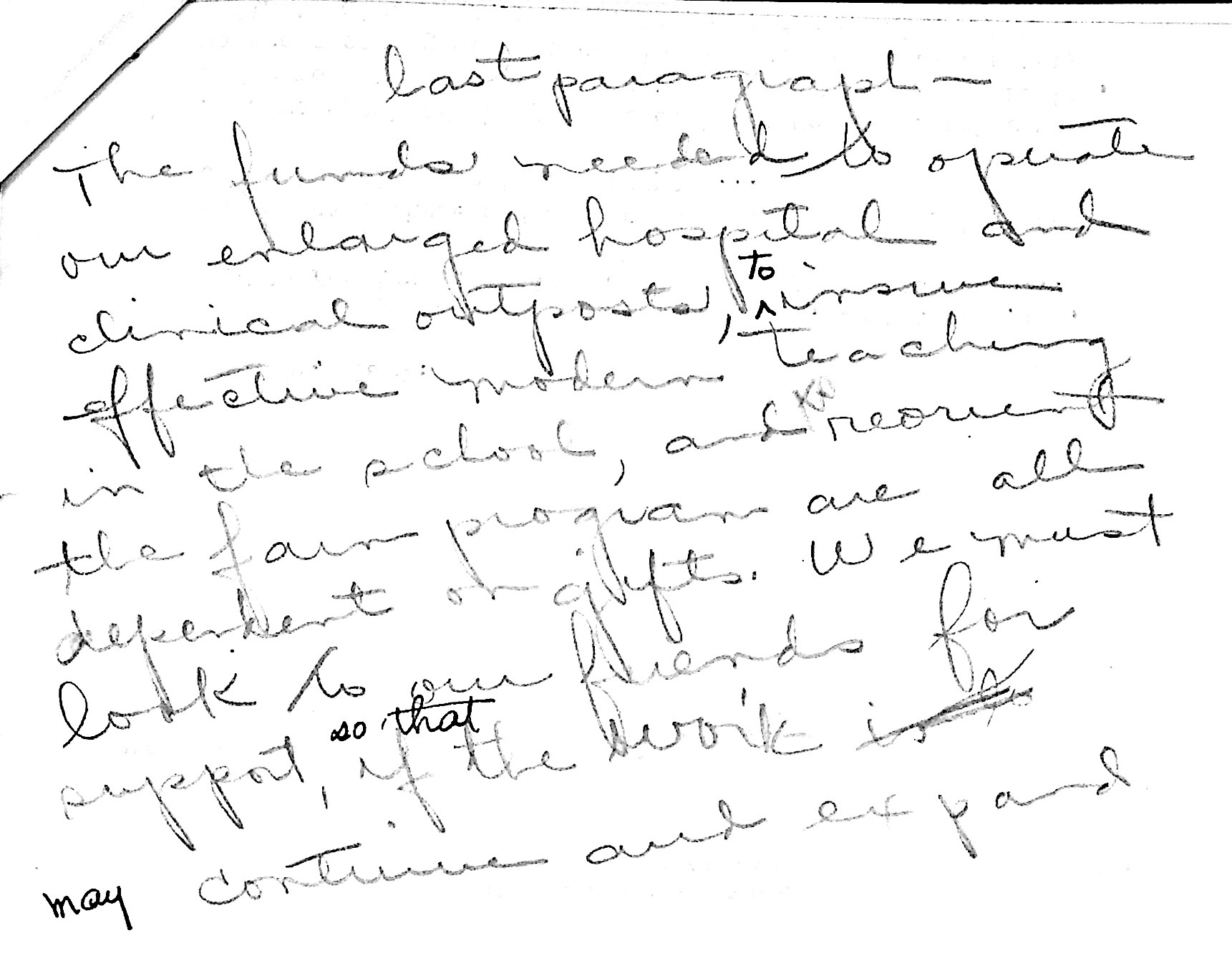 “Last paragraph – The funds needed to operate our enlarged hospital and clinical outposts, to insure effective modern teaching in the school, and to reorient the farm program are all dependent on gifts. We must look to our friends for support, so that the work may continue and expand.”