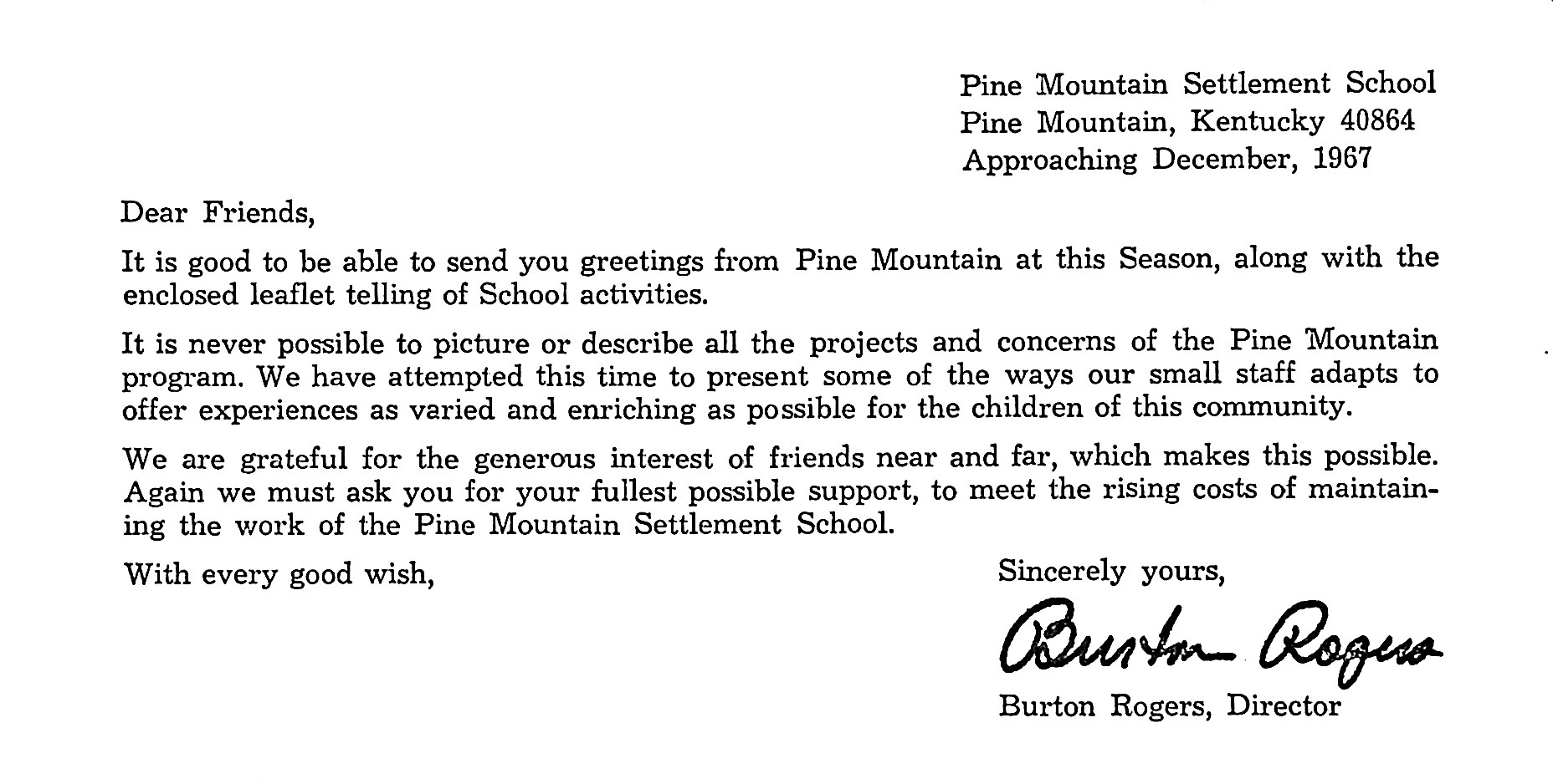 Rogers sends season greetings and encloses a “leaflet telling of School activities … [and] present[ing] some of the ways our small staff adapts to offer experiences as varied and enriching as possible for the children of this community.”
