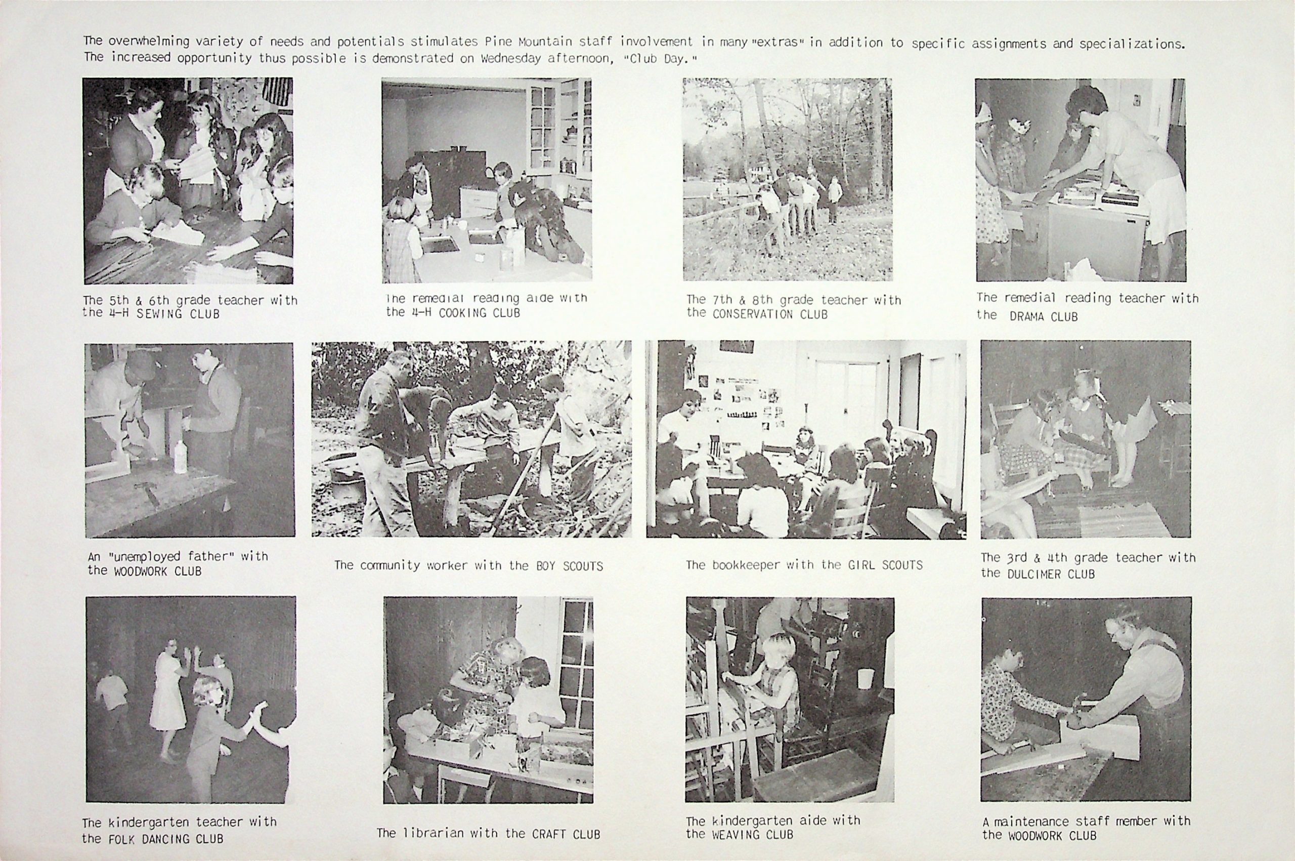 A page of photographs (with captions) depicting “Pine Mountain staff involvement in many ‘extras’ in addition to specific assignments and specializations, as demonstrated on Wednesday afternoon ‘Club Day.'”
