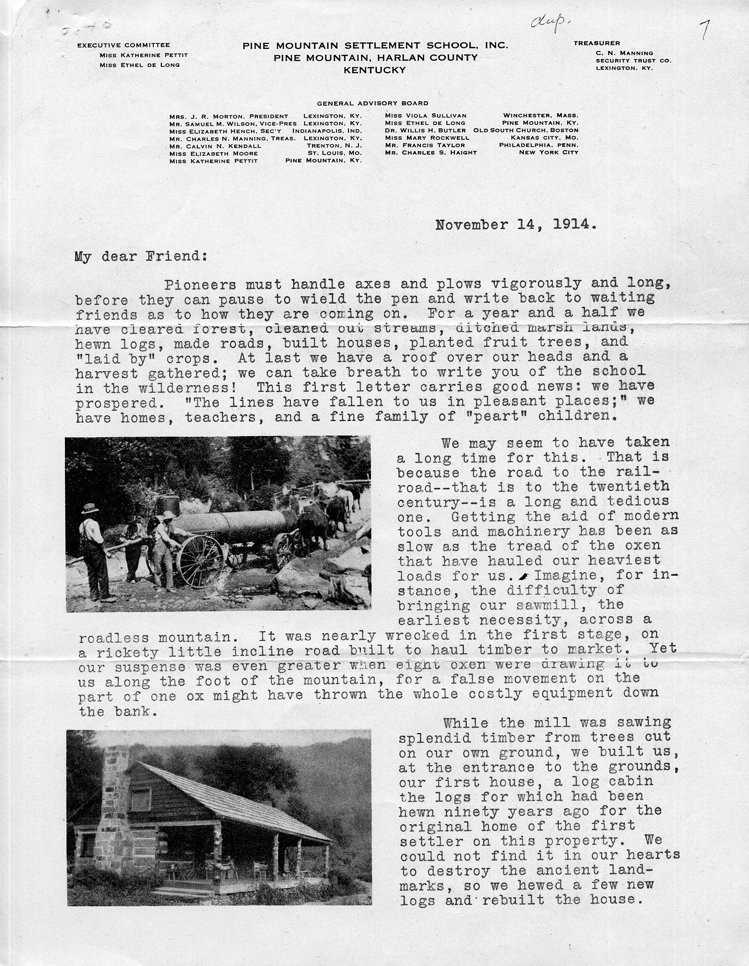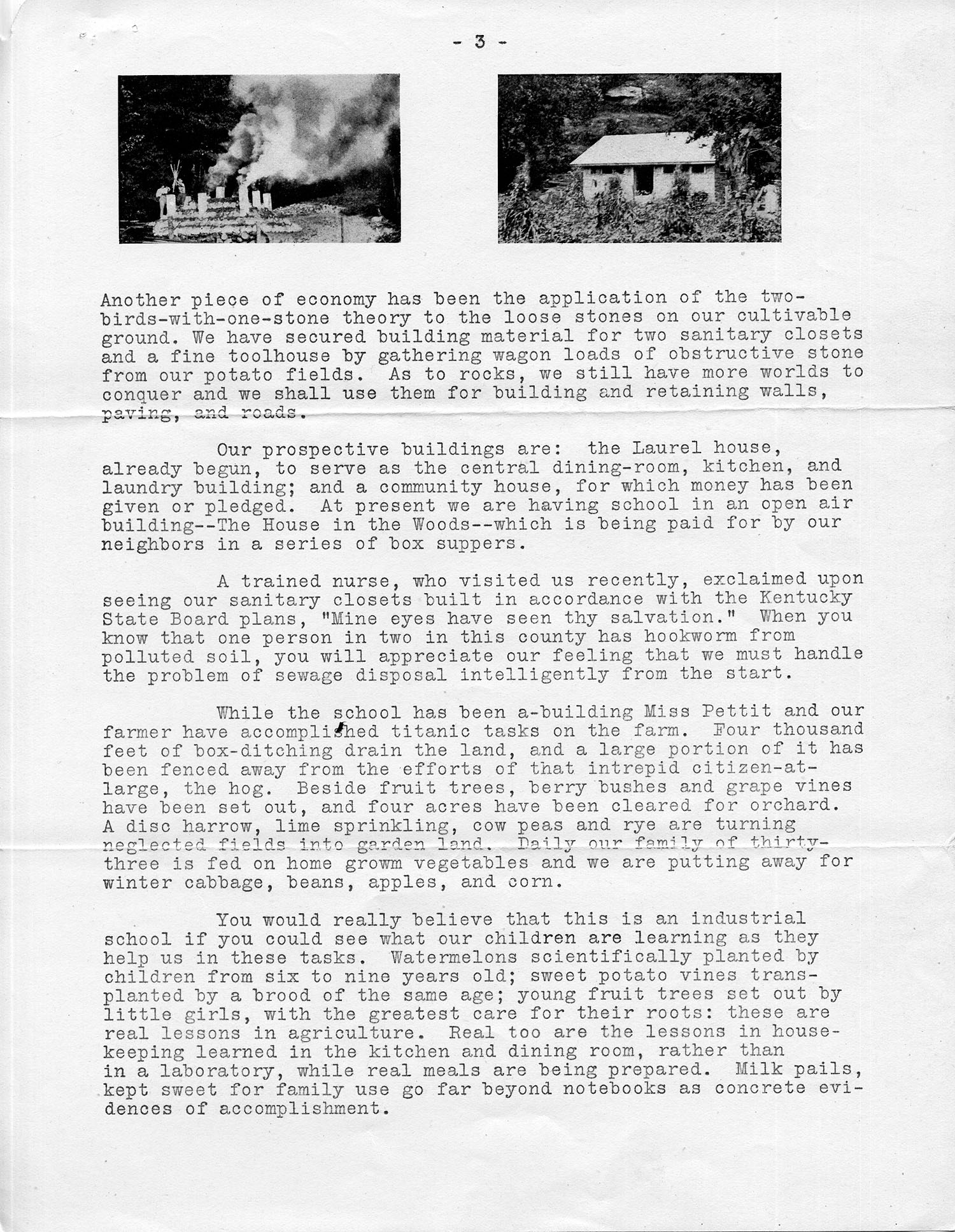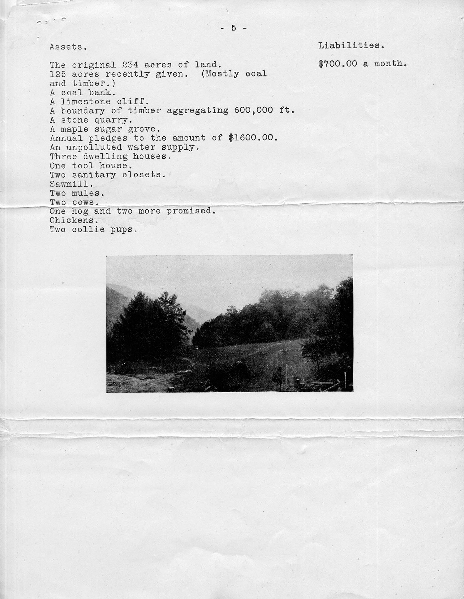 Letterhead lists Executive Committee members, Treasurer, and General Advisory Board ; accomplishments in 1 1/2 years ; difficulties using road to the railroad ; bringing sawmill across mountain ; first house was built, re-using 90-year-old logs ; describes “pioneer” style interior and boarding children ; Big Log house built a month ago ; describes home-like interior, combining the new and the traditional ; workers live in Uncle John Shell’s cottage and two tents ; lime-making ; use of stones on the land for two sanitary closets and toolhouse ; Laurel House begun ; planning a community house ; school in open-air House in the Woods ; handling sewage disposal ; describes farm tasks ; children learn as they work ; lists neighborhood get-togethers ; hygiene talks by trained nurse ; county to appropriate $5000 for road ; experts visited and gave advice, including Mary Rockwell [Hook], architect ; donors have helped meet monthly expenses of nearly $700 ; need $17.00 more a day ; list of liabilities and assets